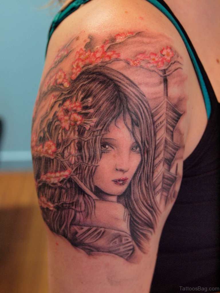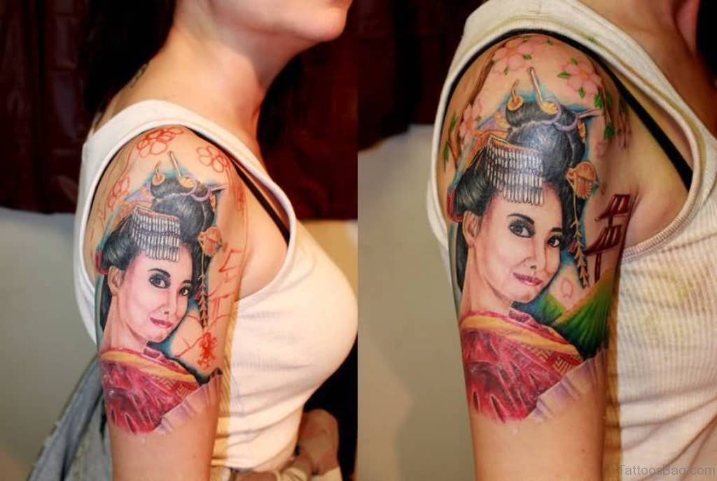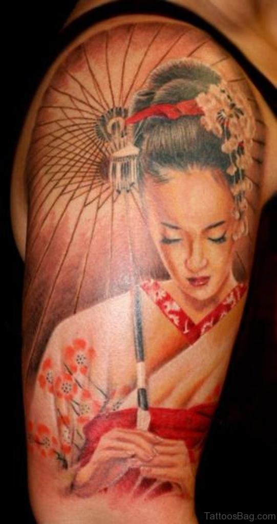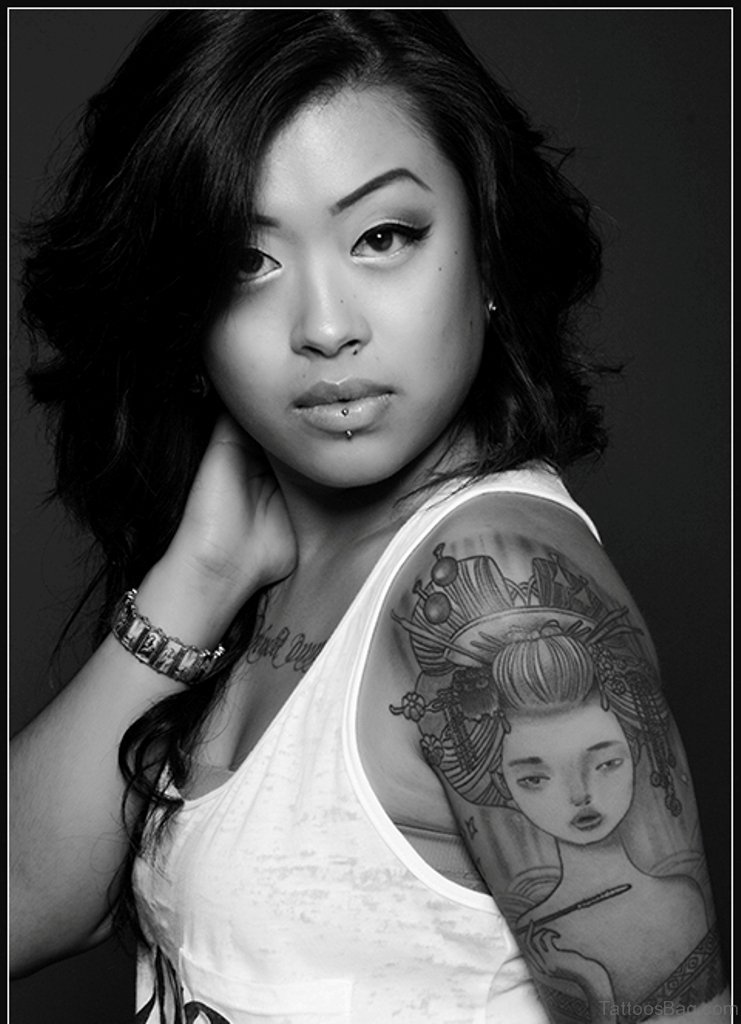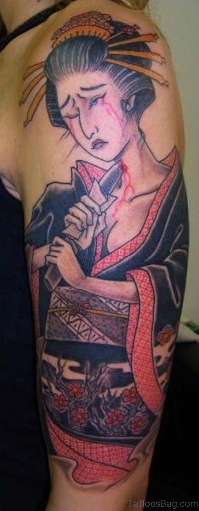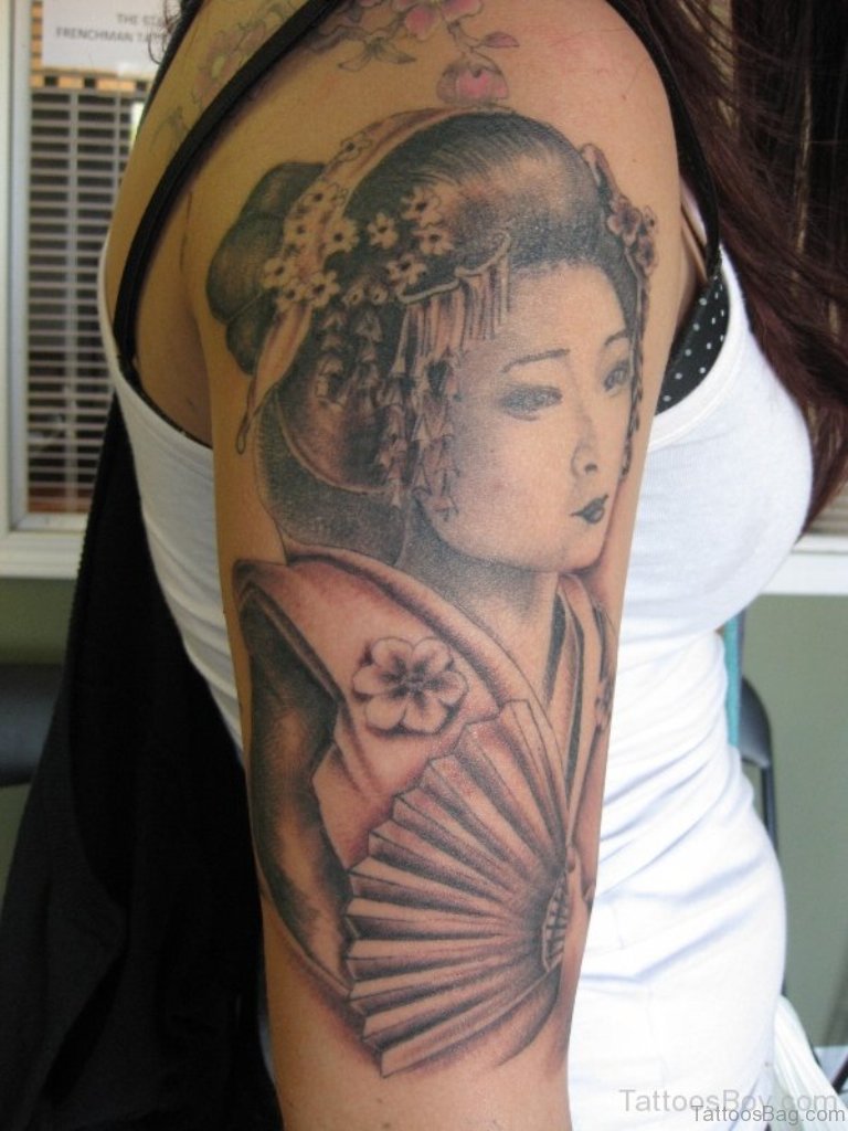 Grey Ink Geisha Tattoo On Girl Right Half Sleeve