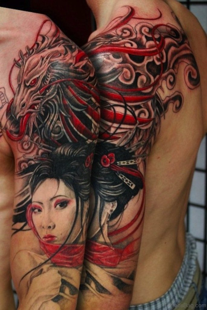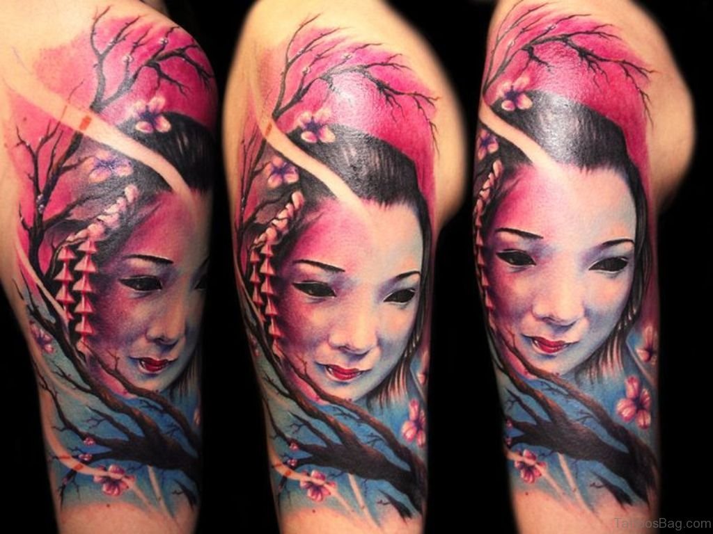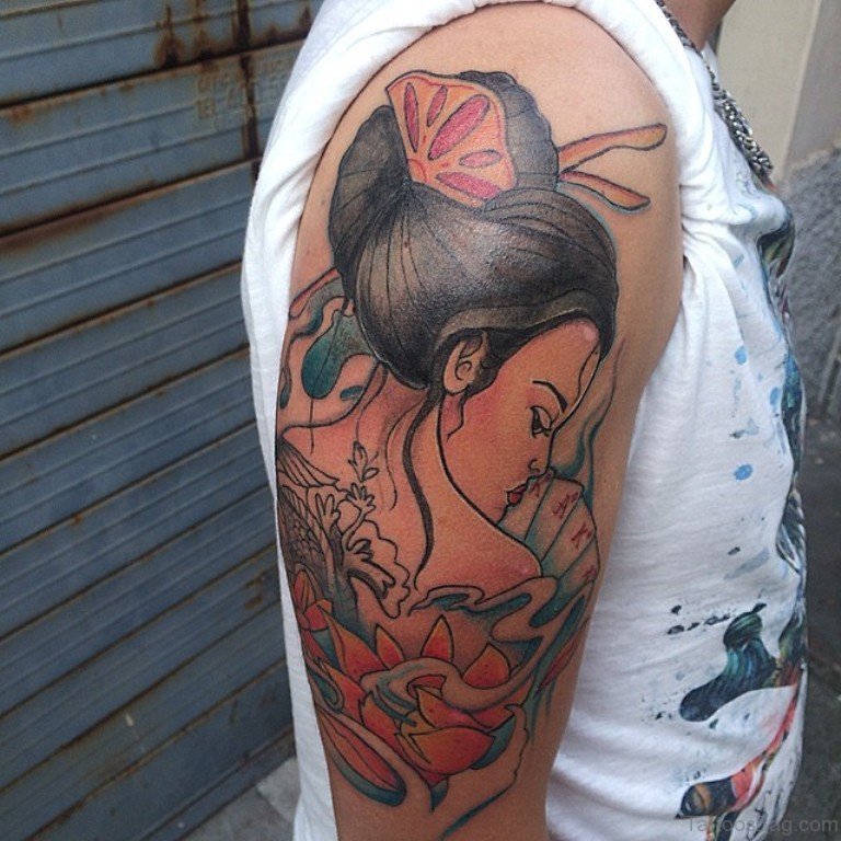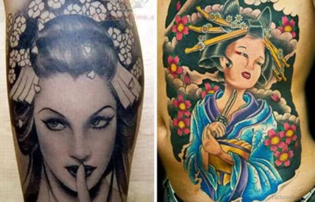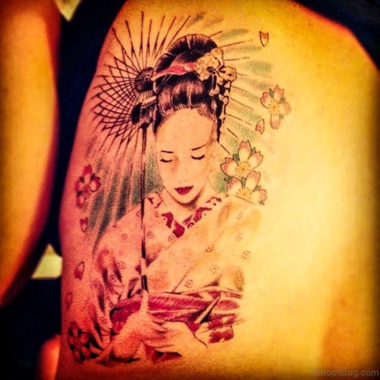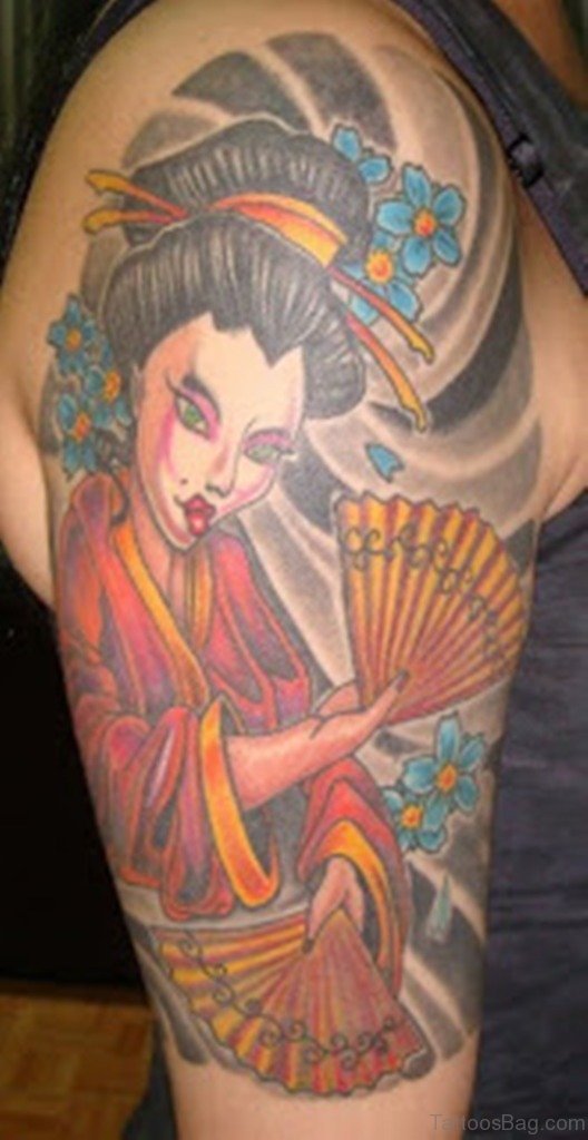 Grey Ink Geisha Tattoo On Girl Right Half Sleeve