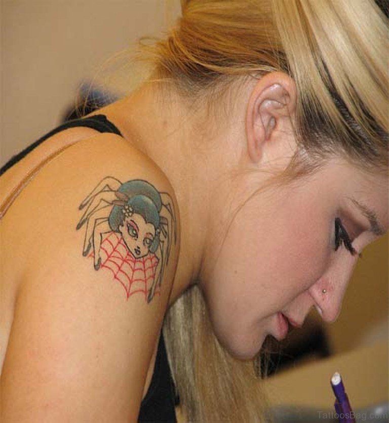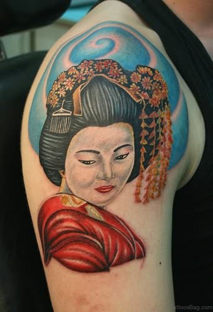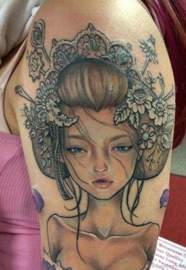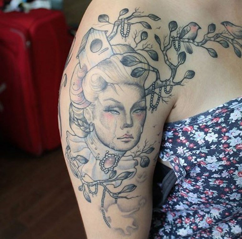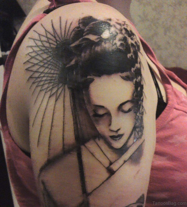 Grey Ink Geisha Head Tattoo On Left Shoulder