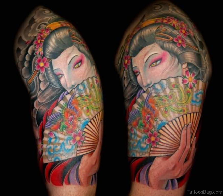 Grey Ink Geisha Tattoo On Left Half Sleeve For Girls