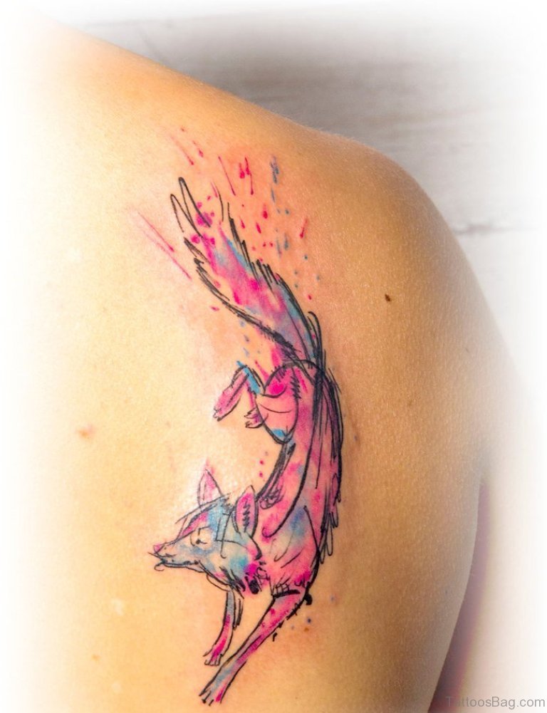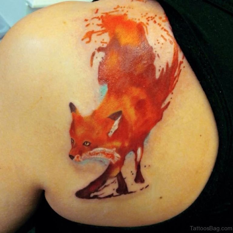 Watercolor Fox Tattoo On Left Back Shoulder