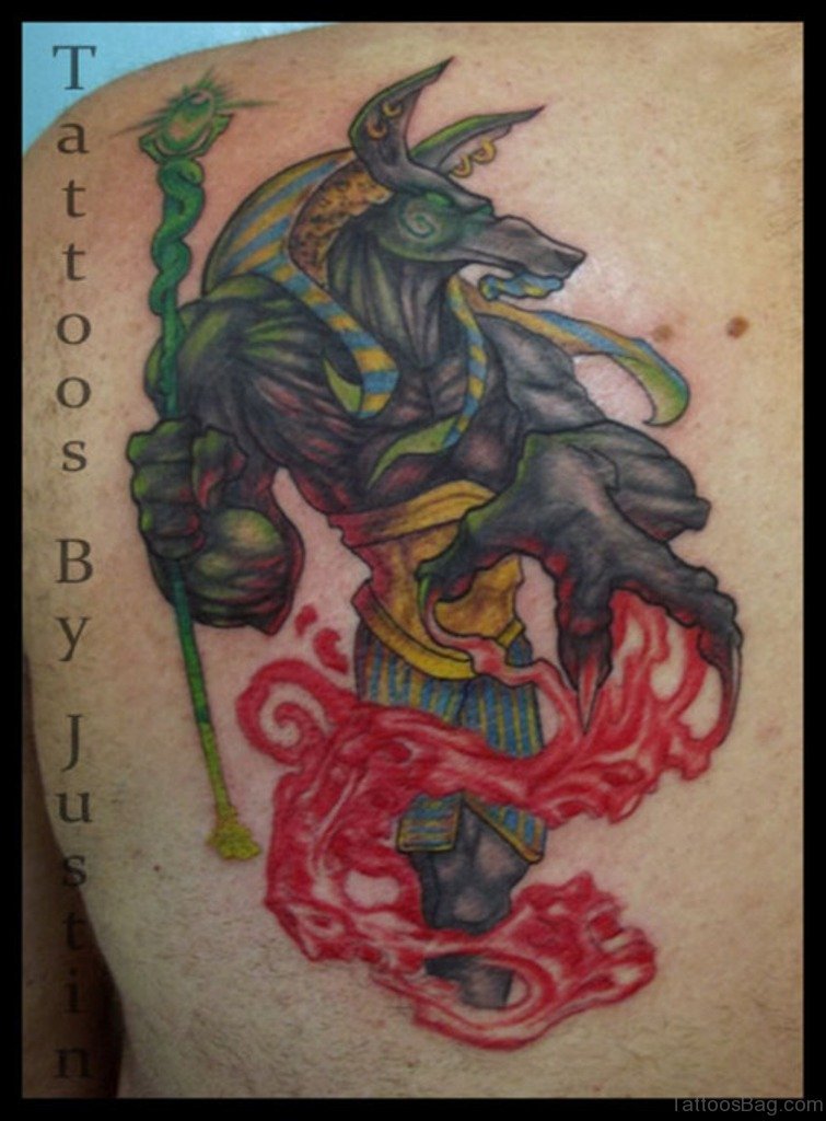 Grey Ink Egyptian Anubis Tattoo On Right Shoulder