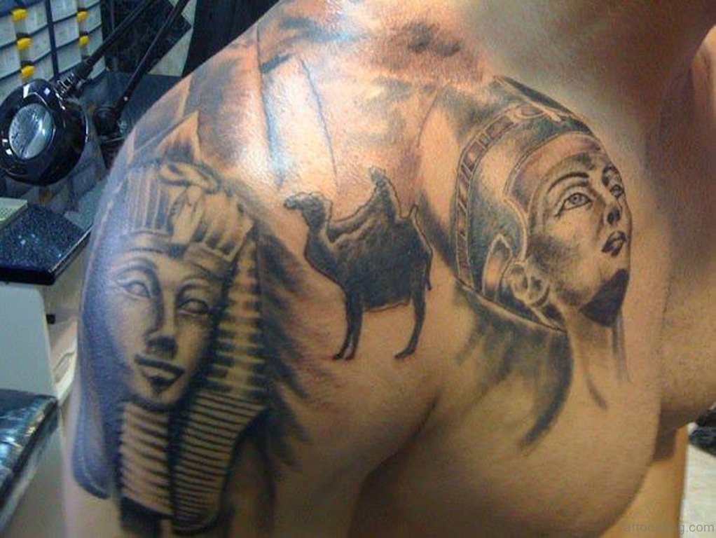 Grey Ink Egyptian Tattoo On Right Back Shoulder