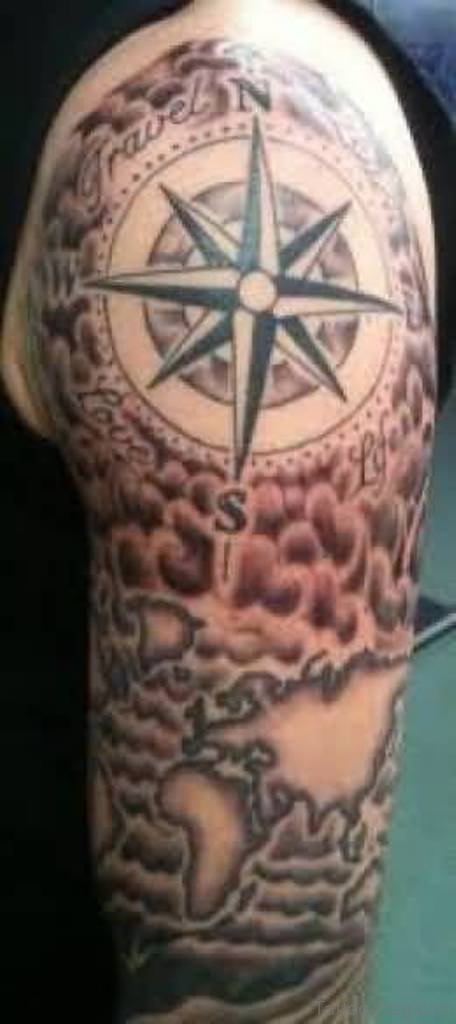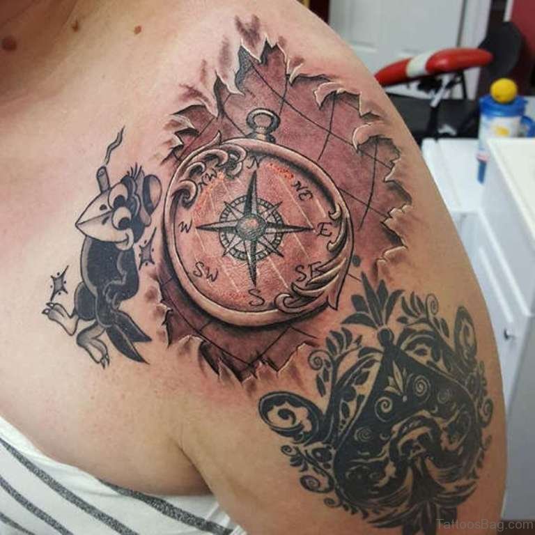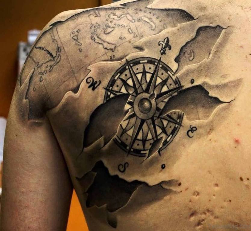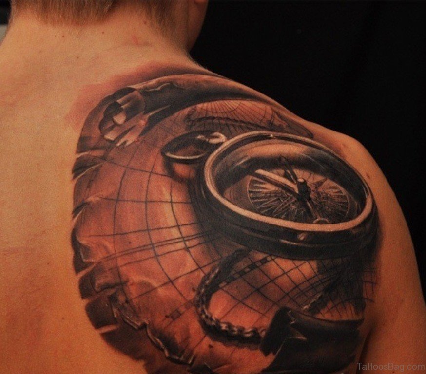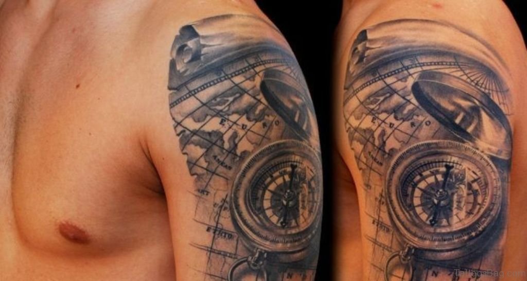 Black And Grey 3D Compass With Map Tattoo On Man Left Shoulder