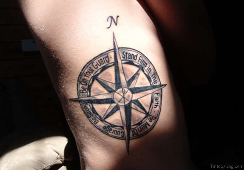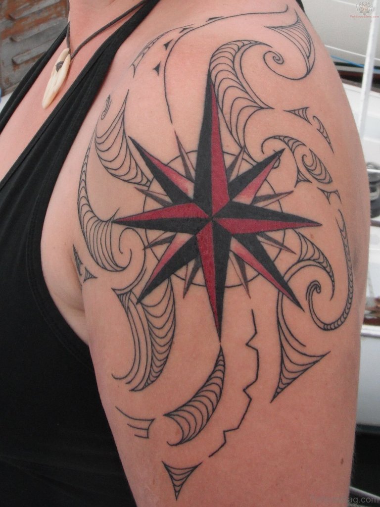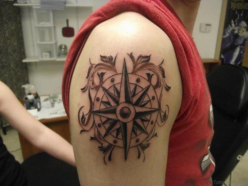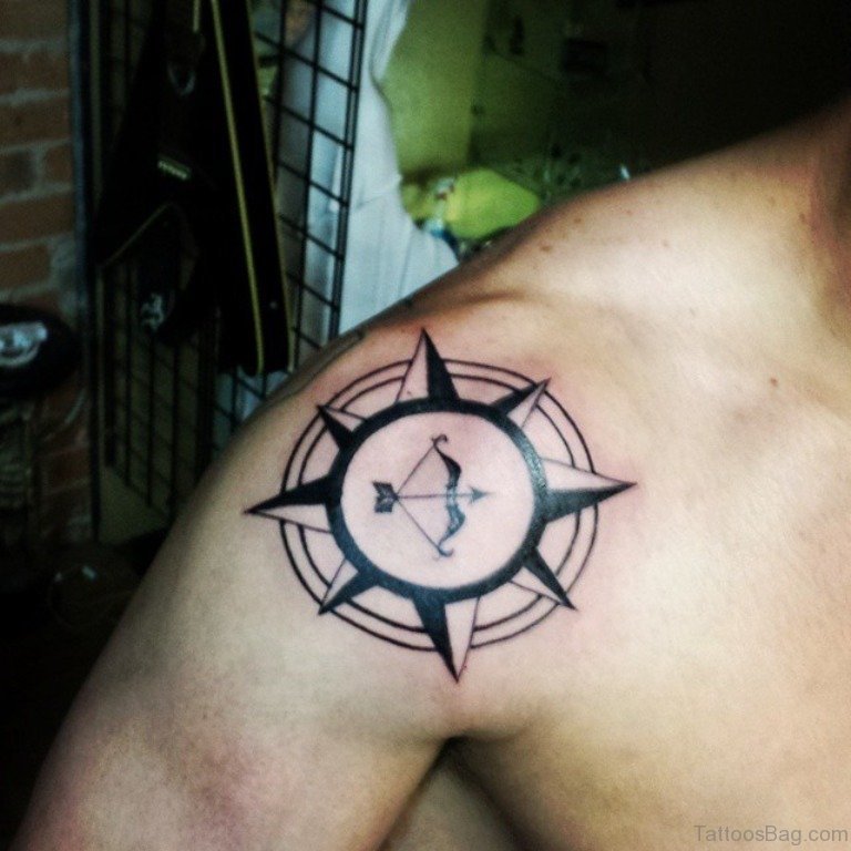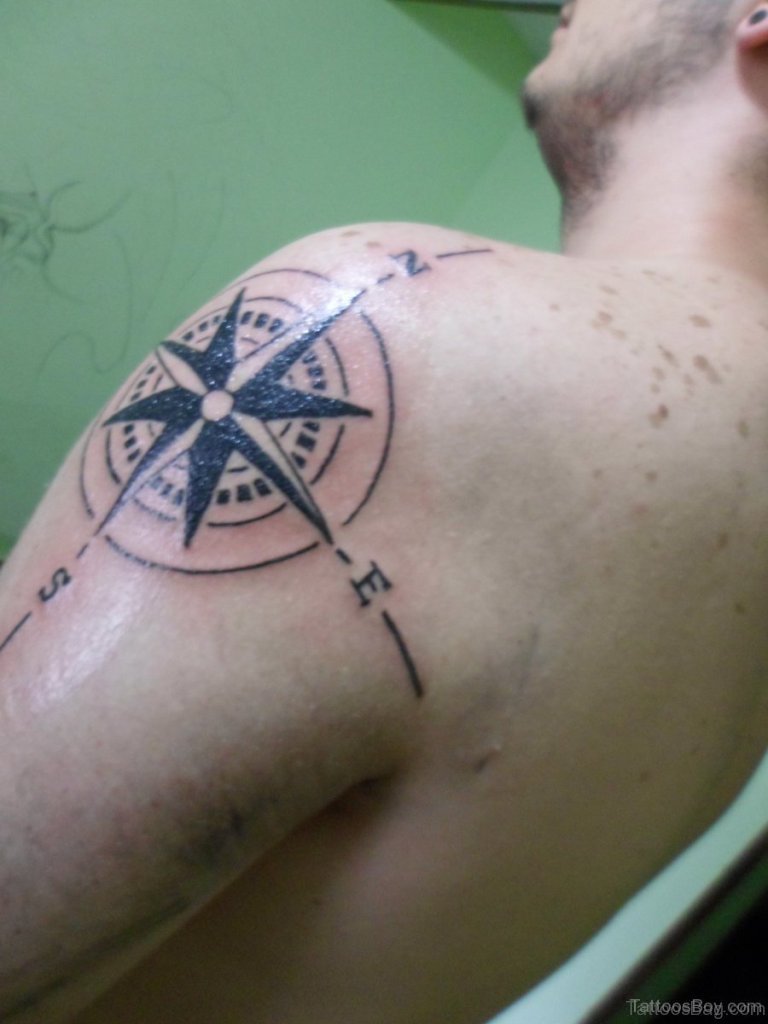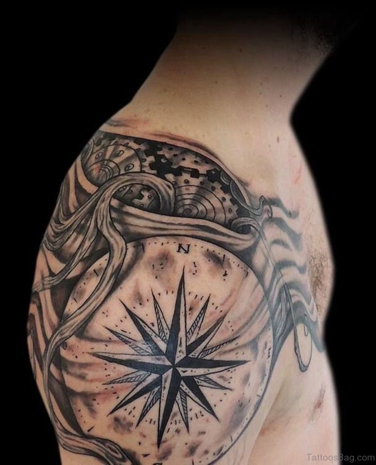 Black Ink Amazing Celtic Knot And Compass Tattoo On Men Shoulder