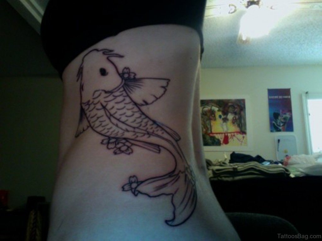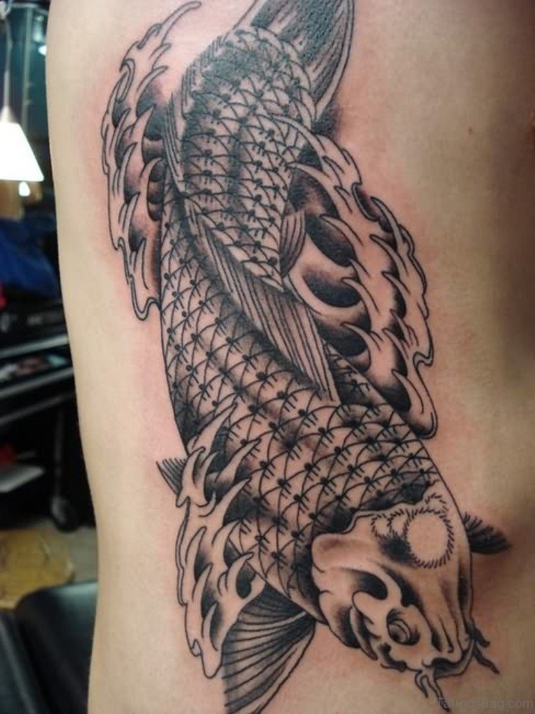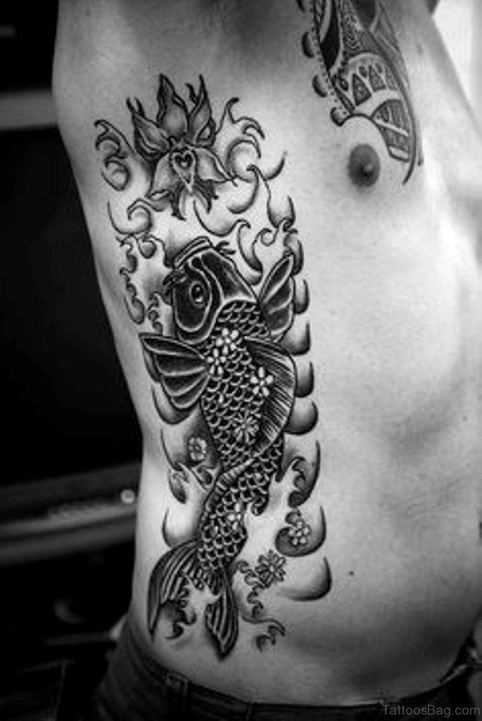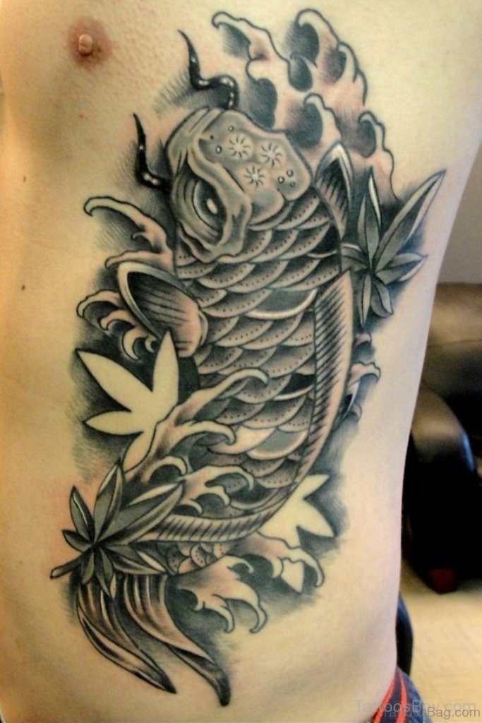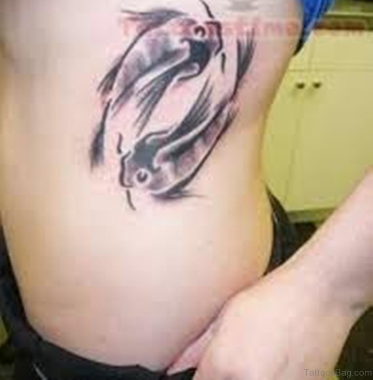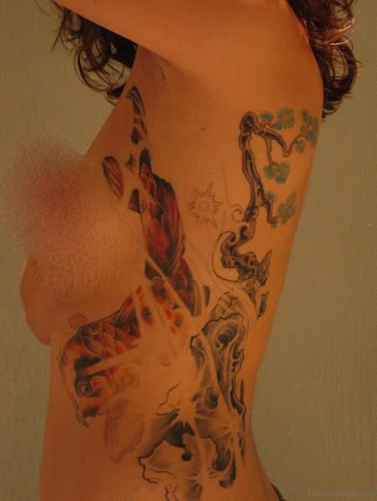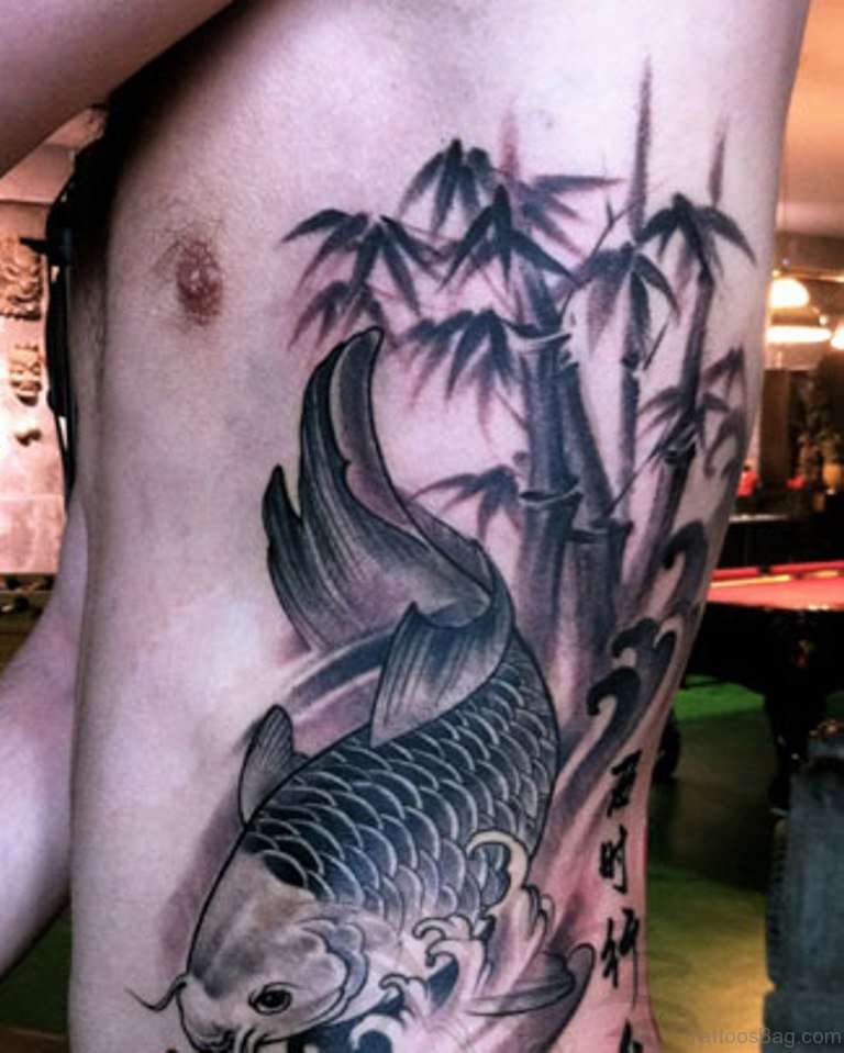Grey Ink Fish And Bamboo Tree Tattoo On Side Rib