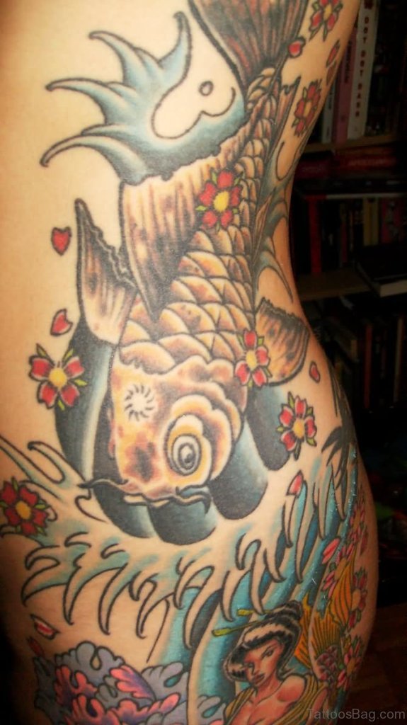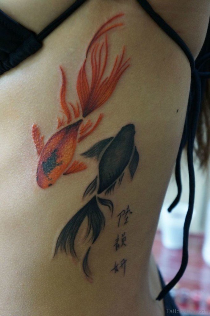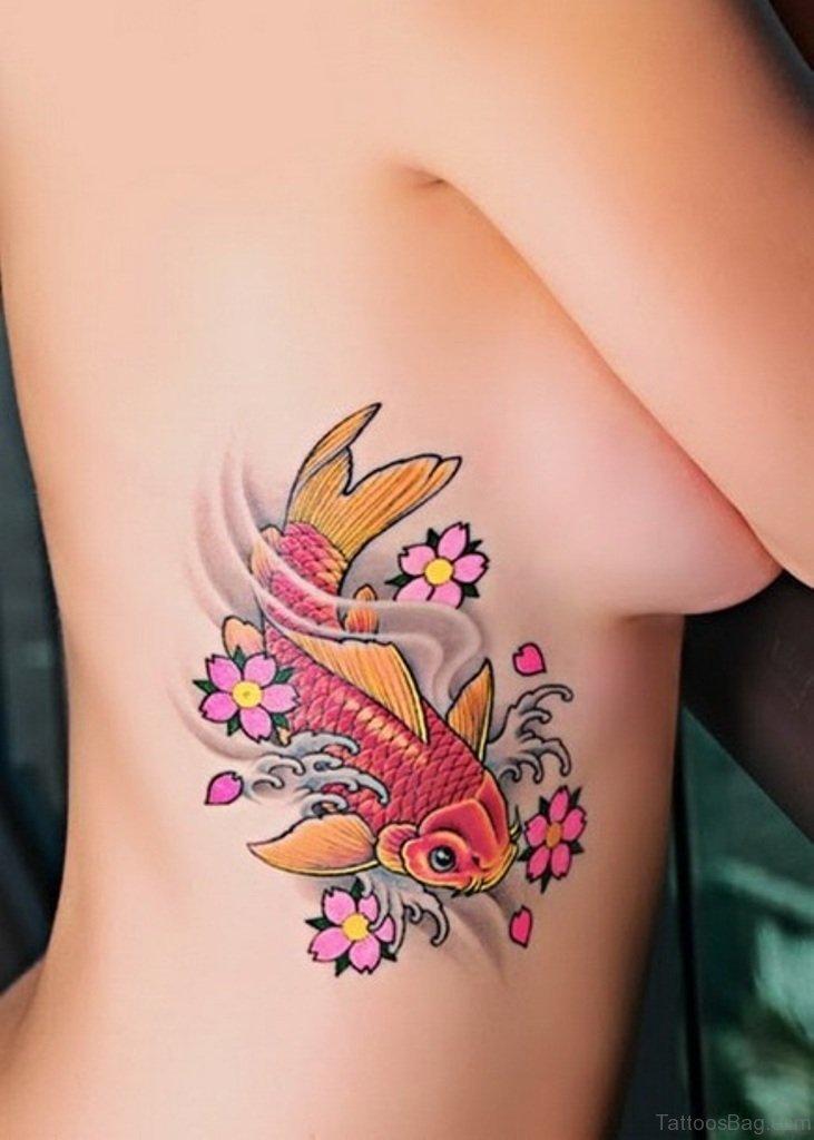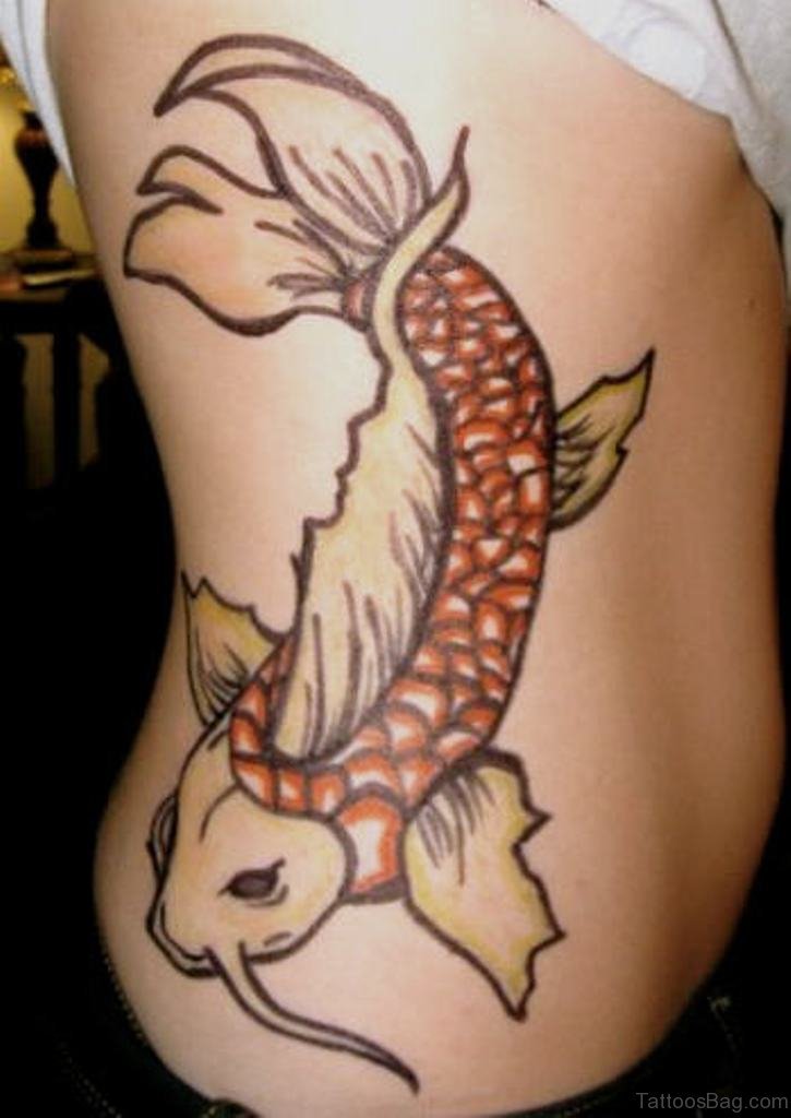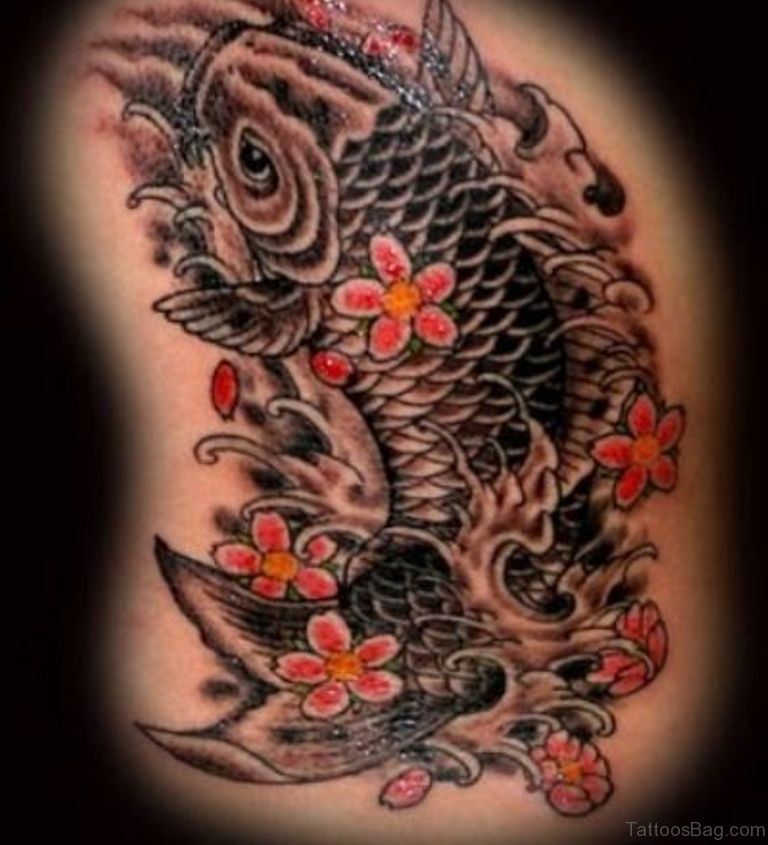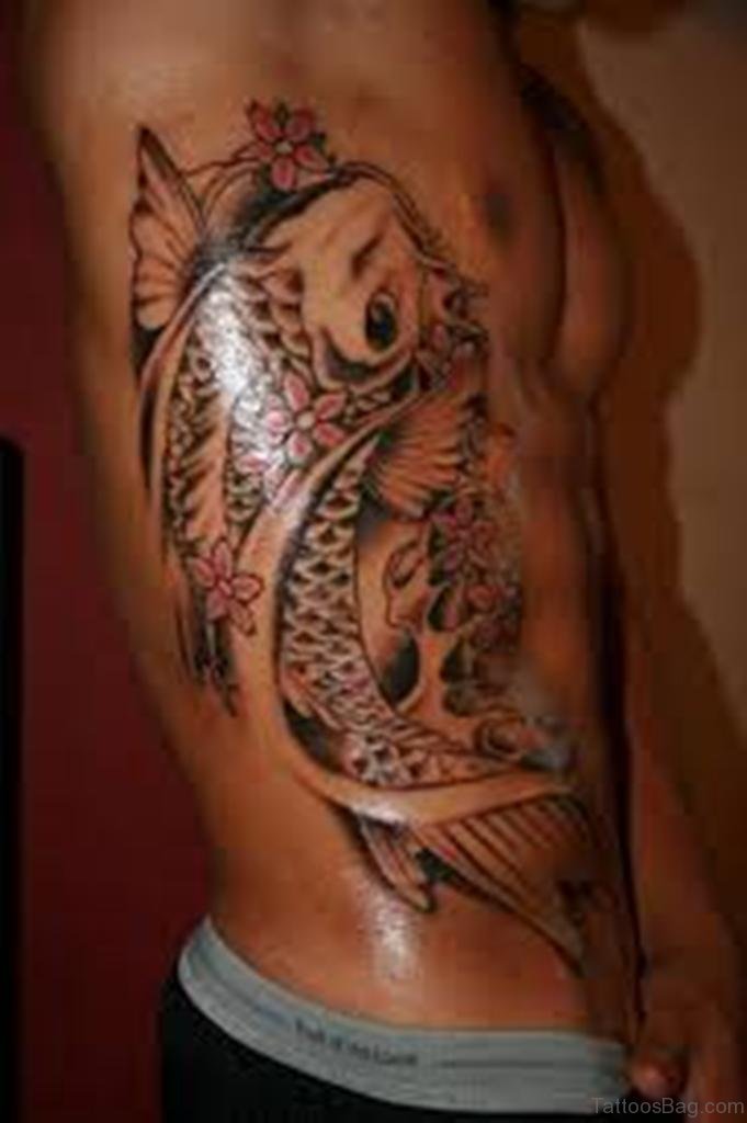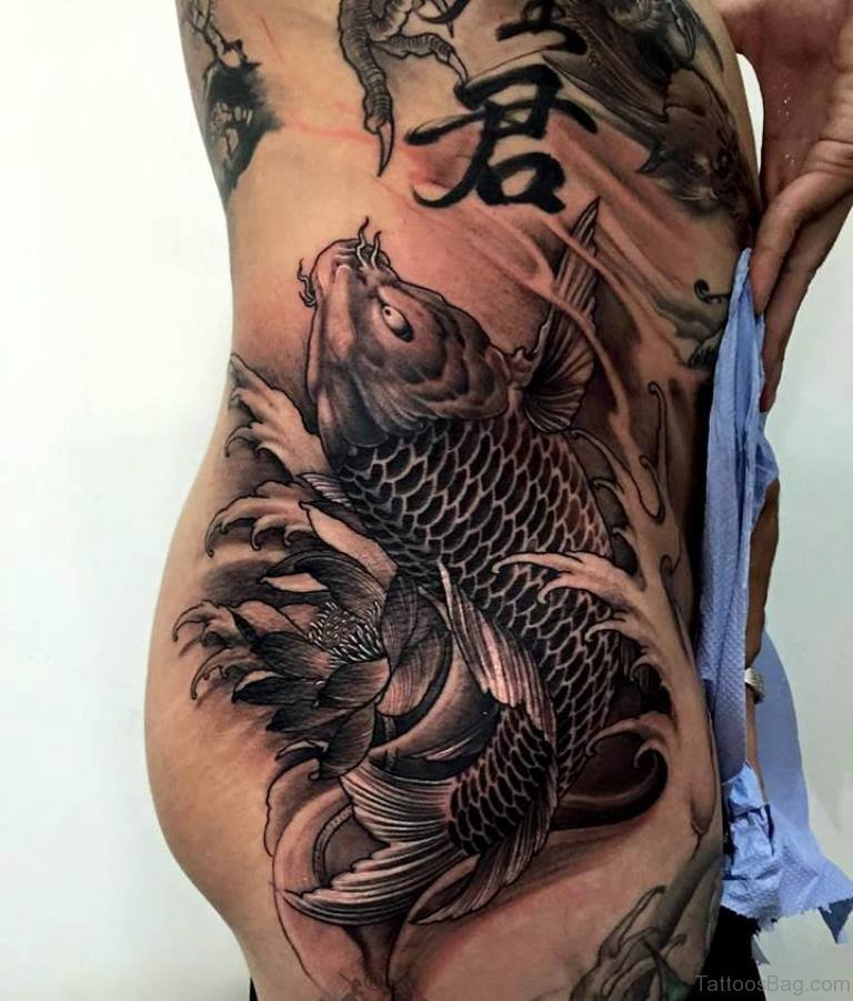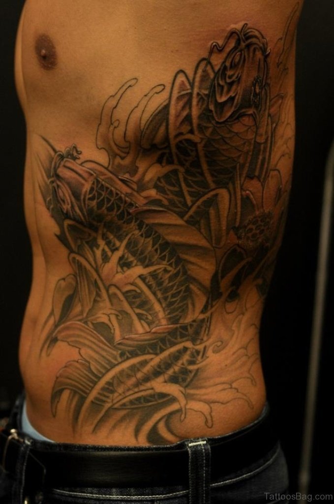 Grey Ink Fish And Bamboo Tree Tattoo On Side Rib