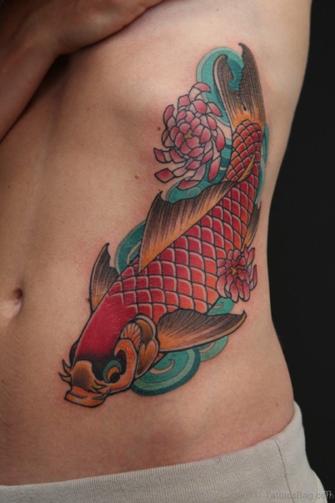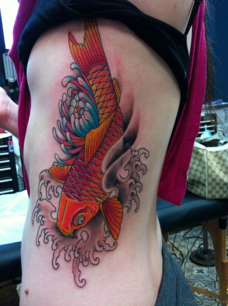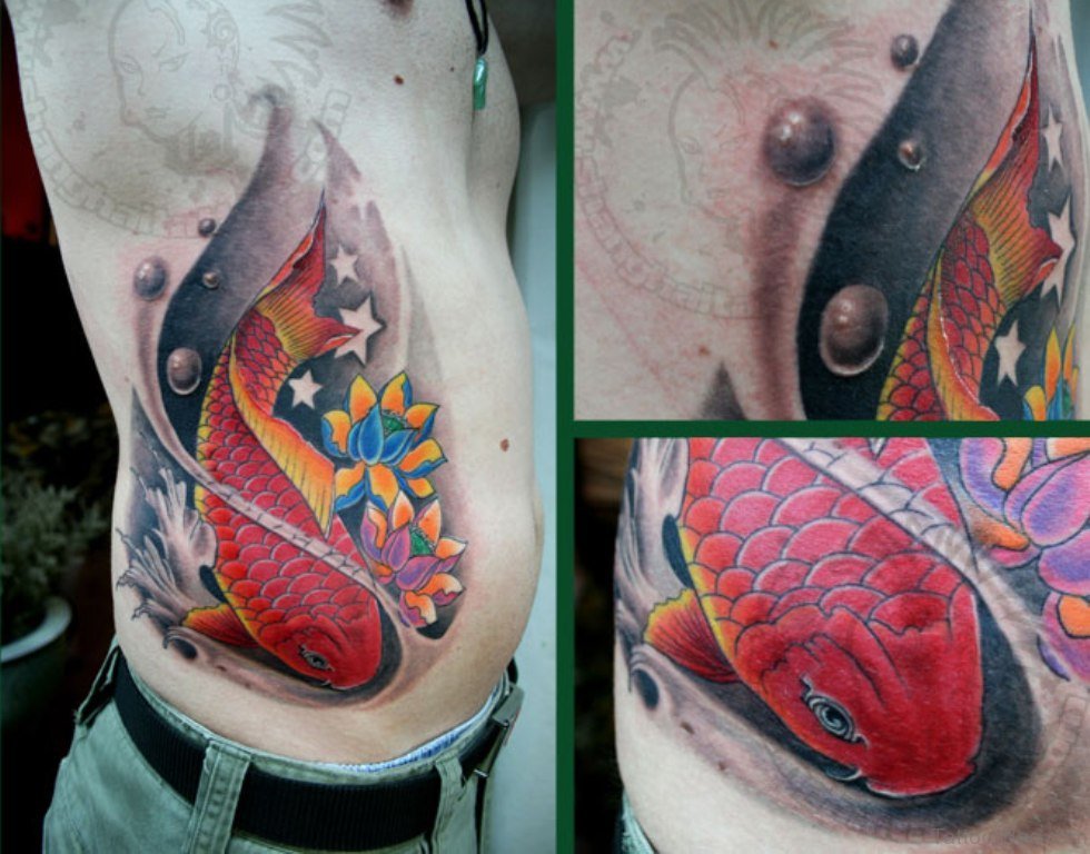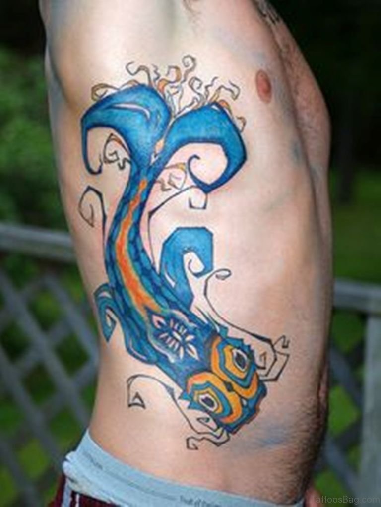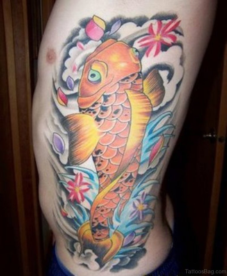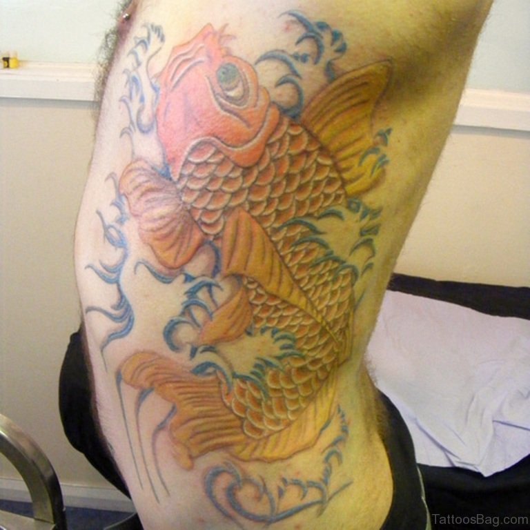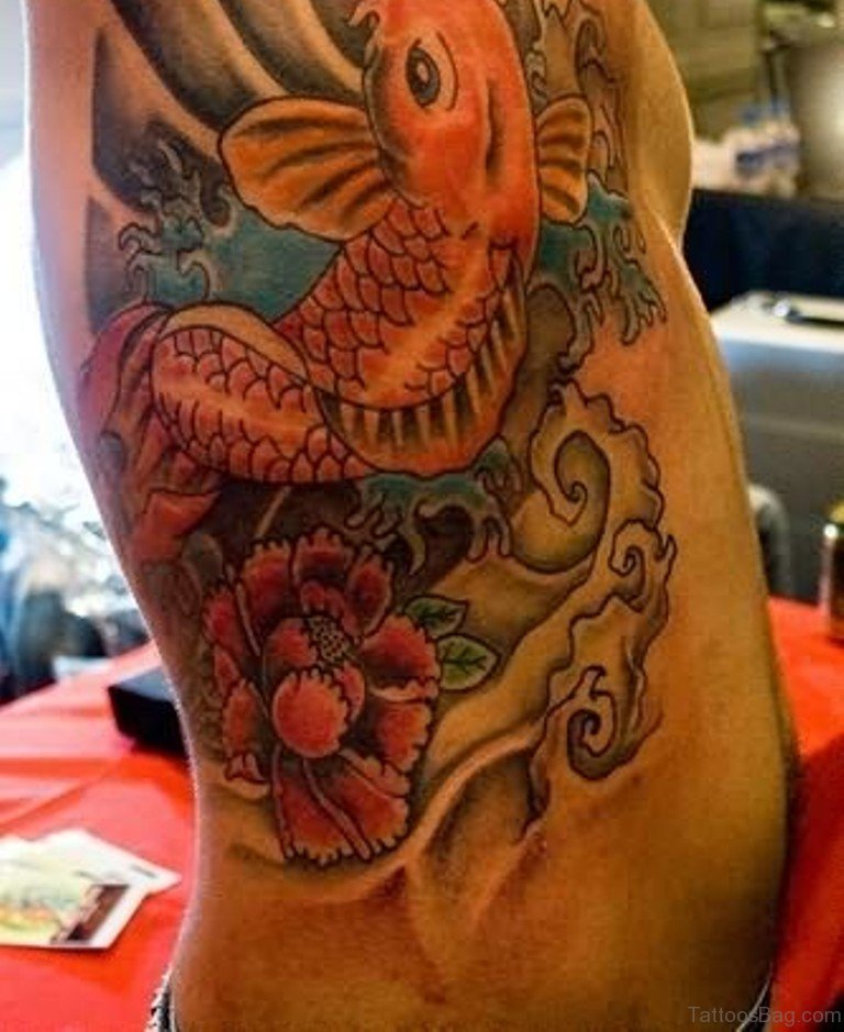 Grey Ink Fish And Bamboo Tree Tattoo On Side Rib