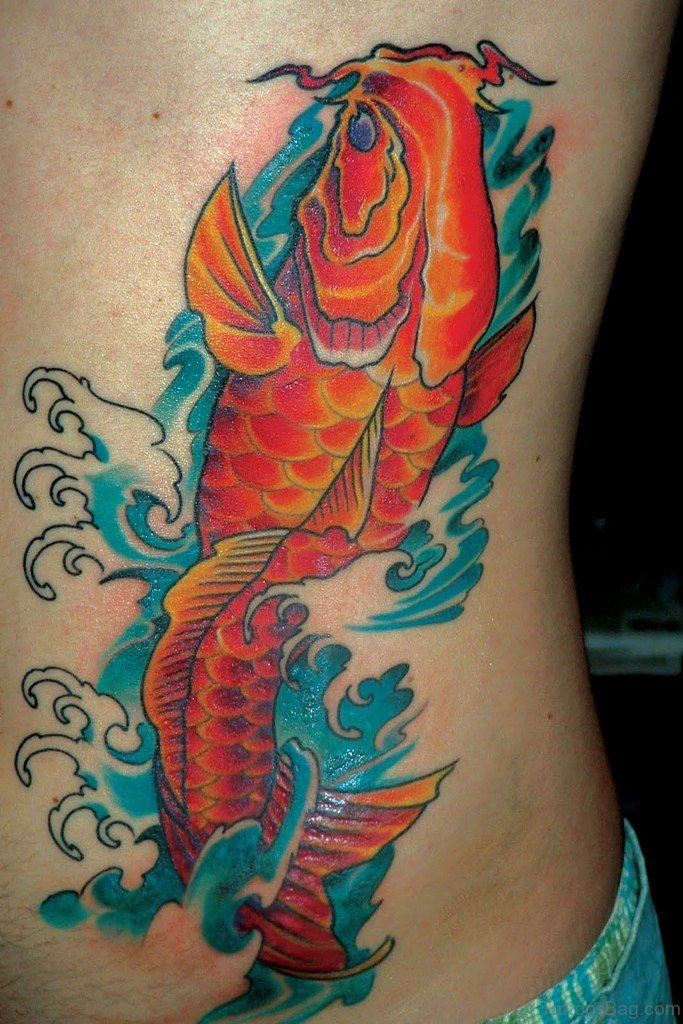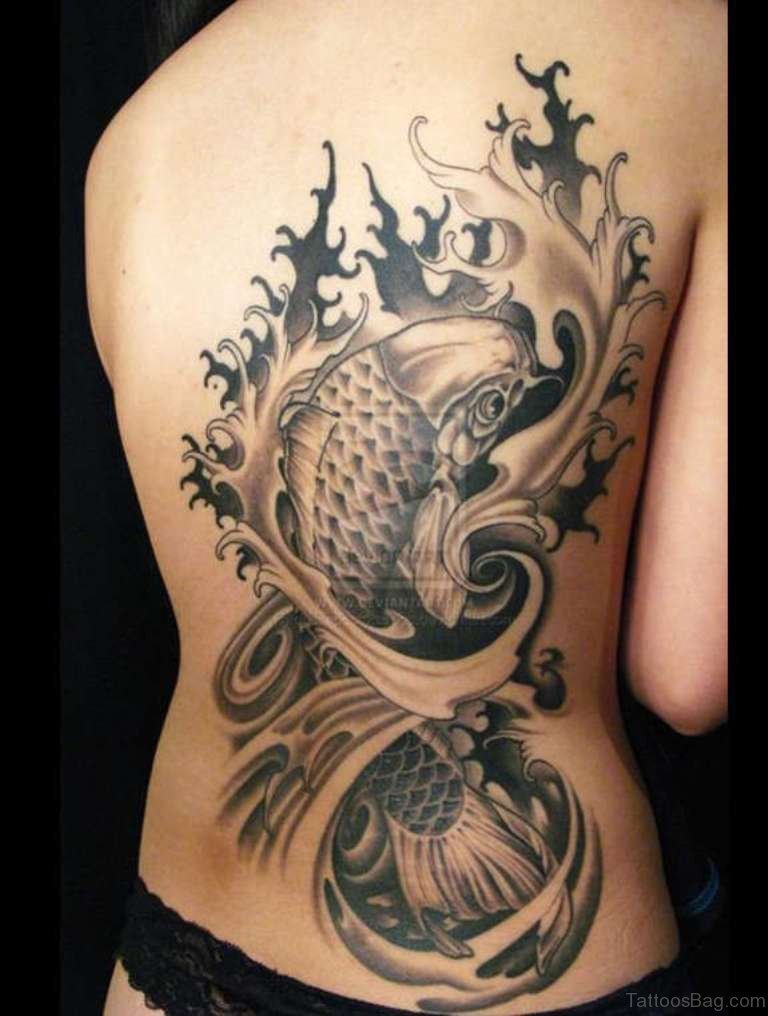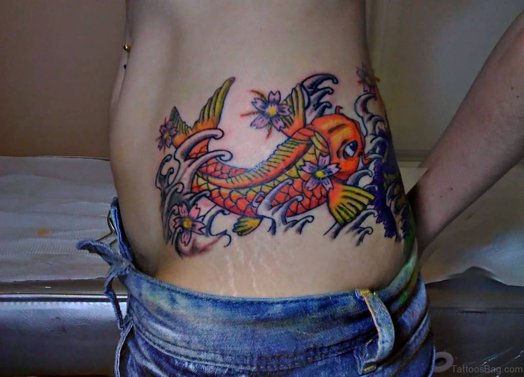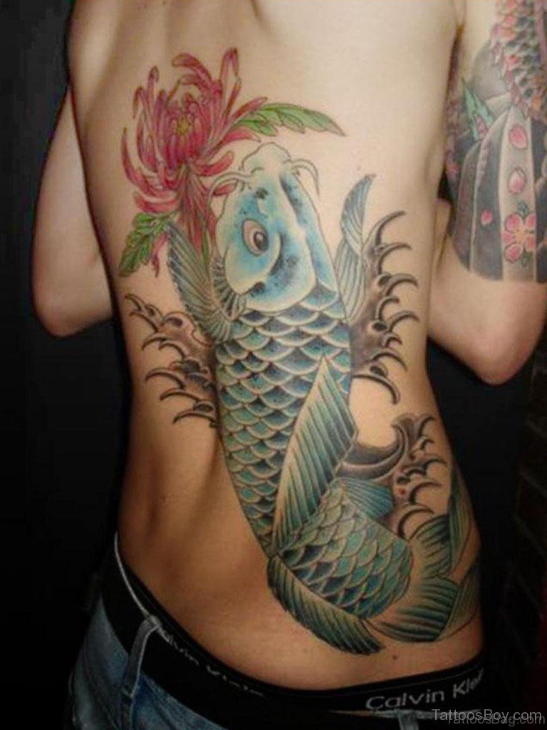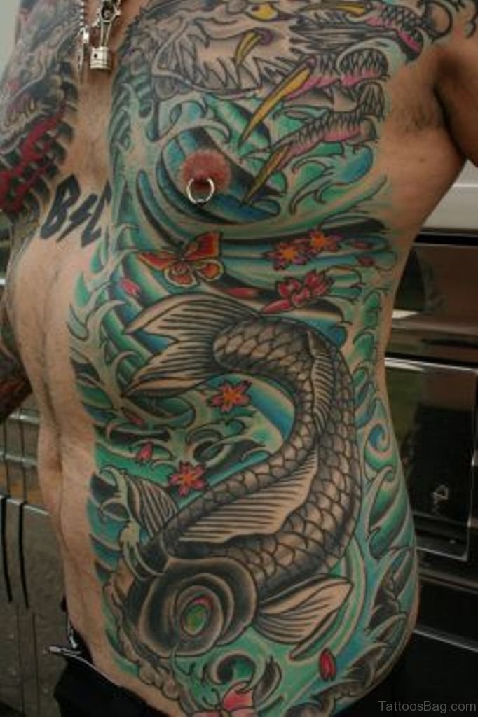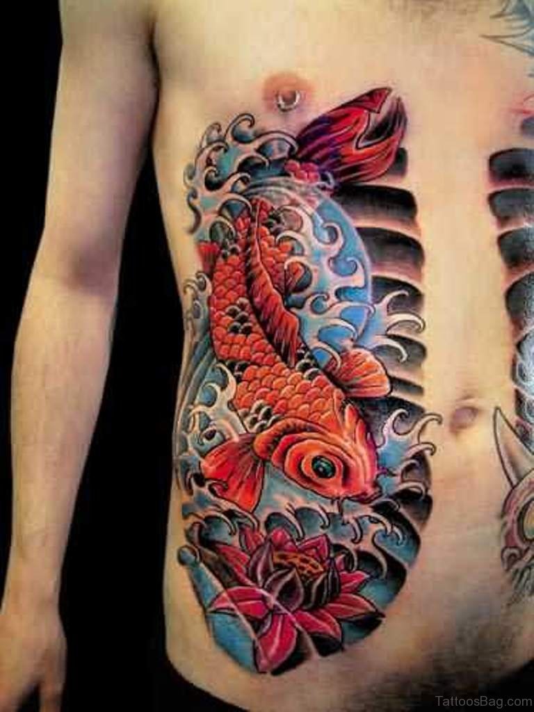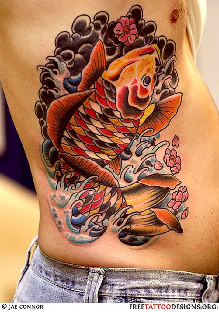 Grey Ink Fish And Bamboo Tree Tattoo On Side Rib