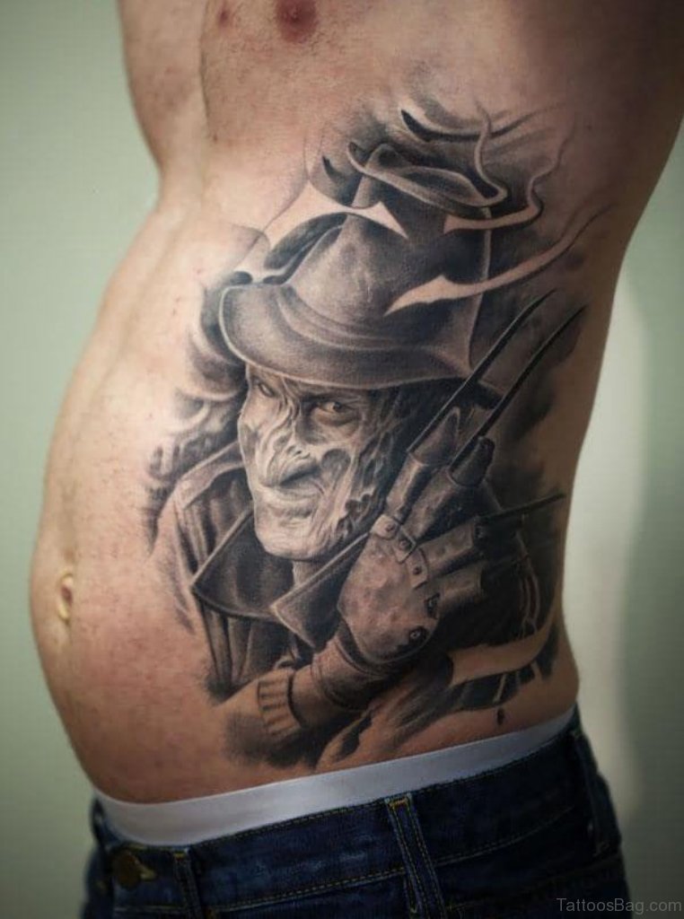 Grey Ink 3D Freddy Krueger Portrait Tattoo On Side Rib