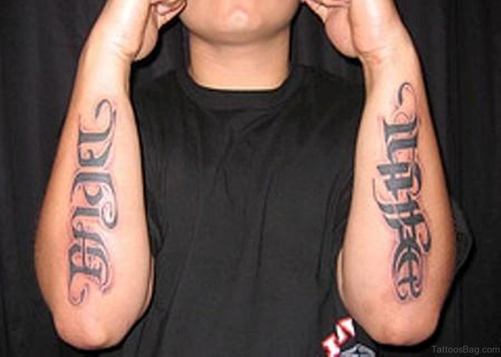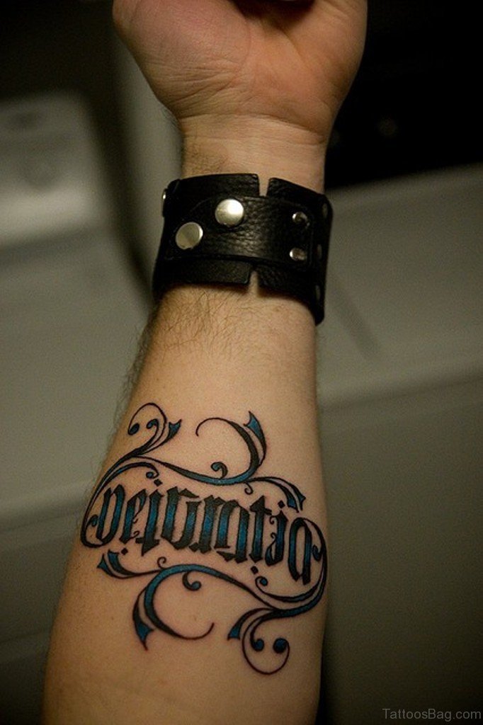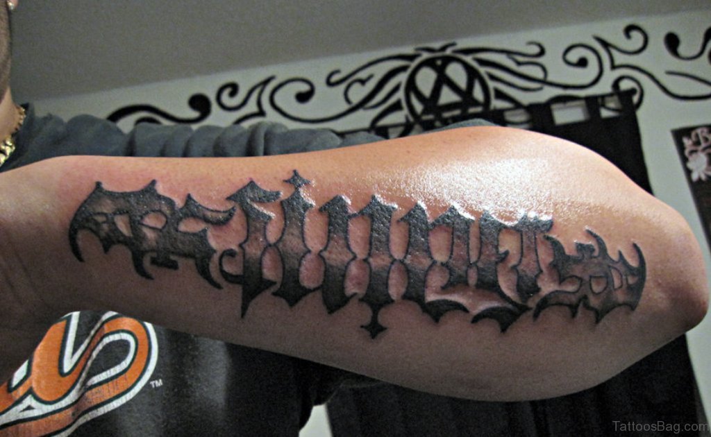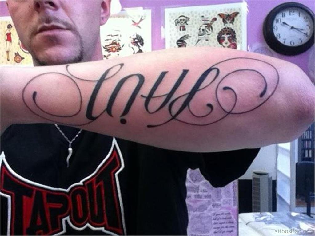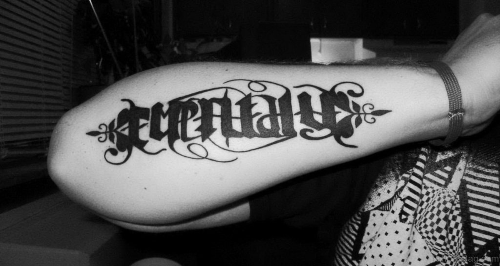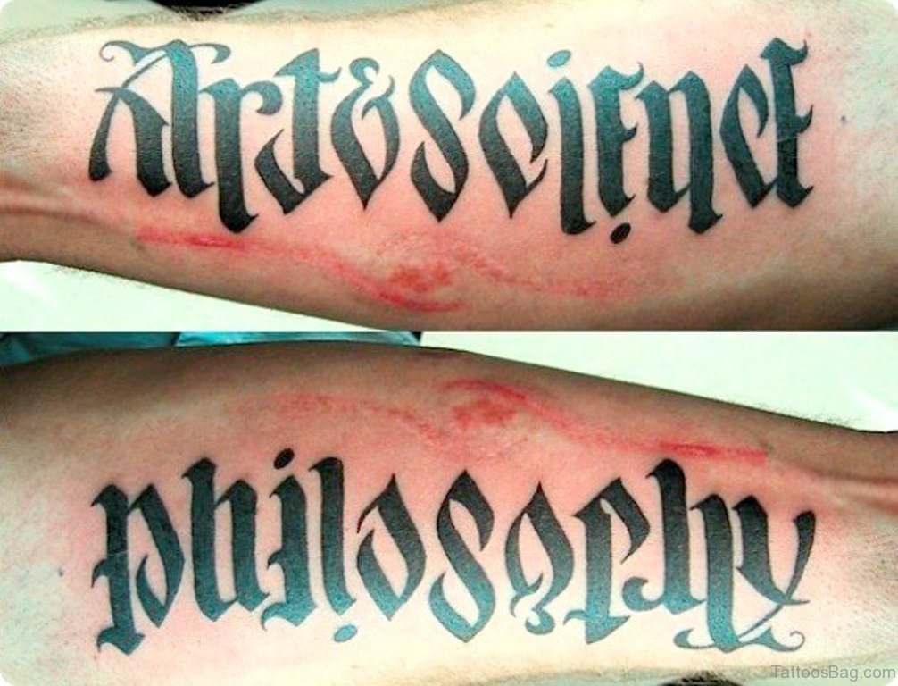 Amazing Ambigram Philosophy Lettering Tattoo Design For Arm