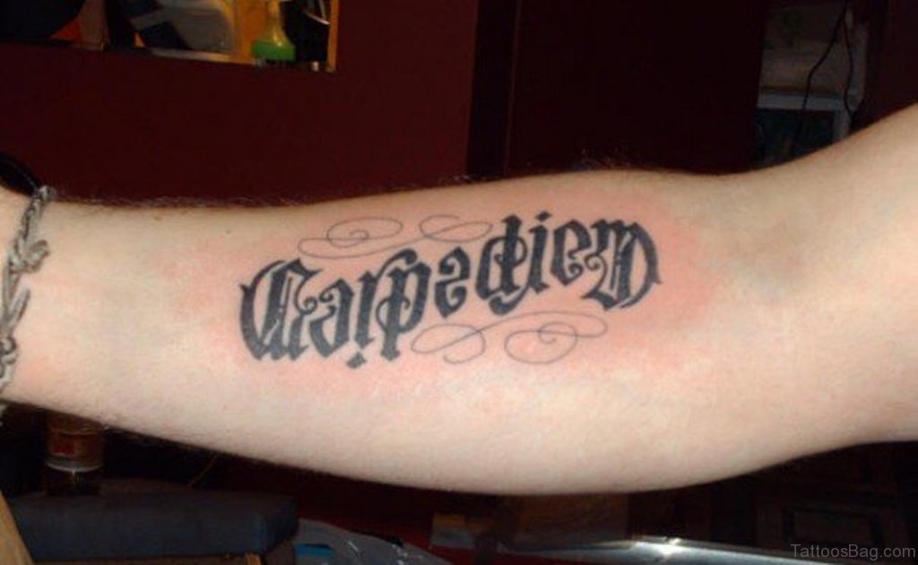 Attractive Carpe Diem Ambigram Tattoo On Right Arm