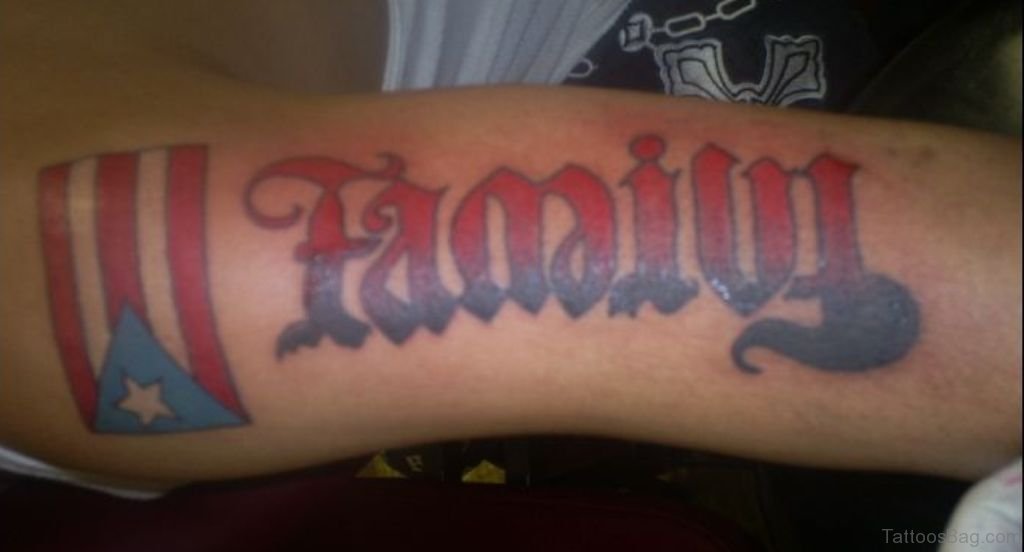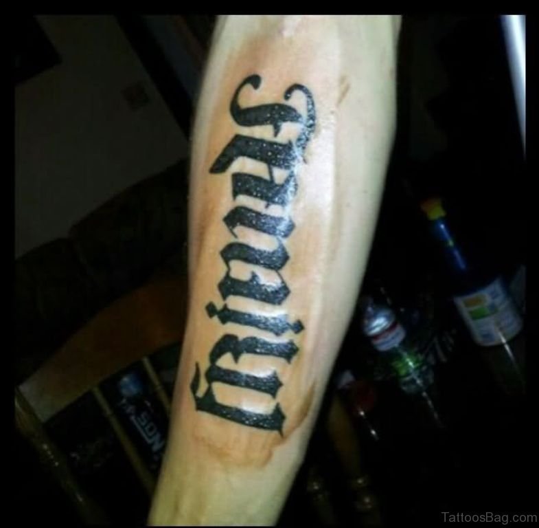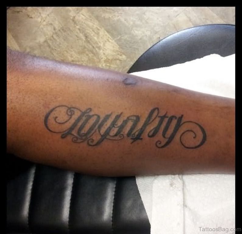 Black Ink Loyalty Ambigram Tattoo On Arm