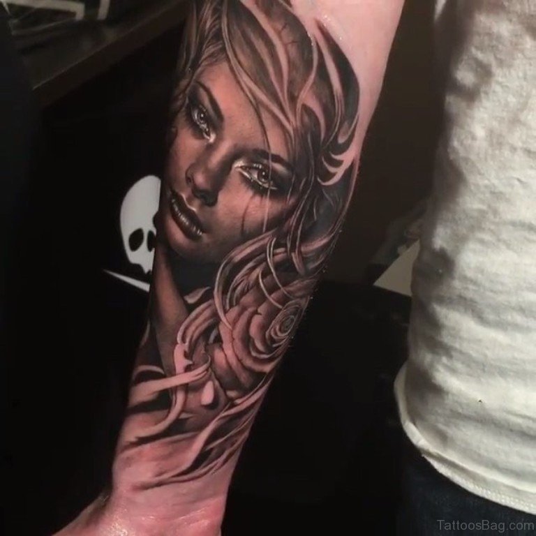 Amazing Portrait Girl Tattoo On Arm