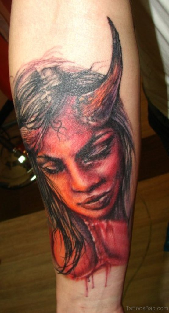 Devil Girl Portrait Tattoo On Arm