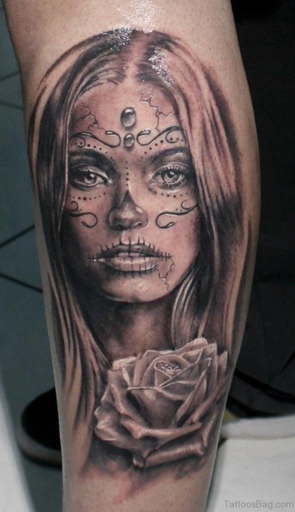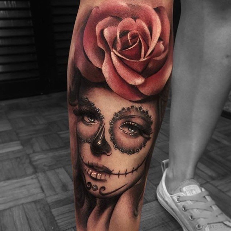 Amazing Rose And Girl Portrait Tattoo Design