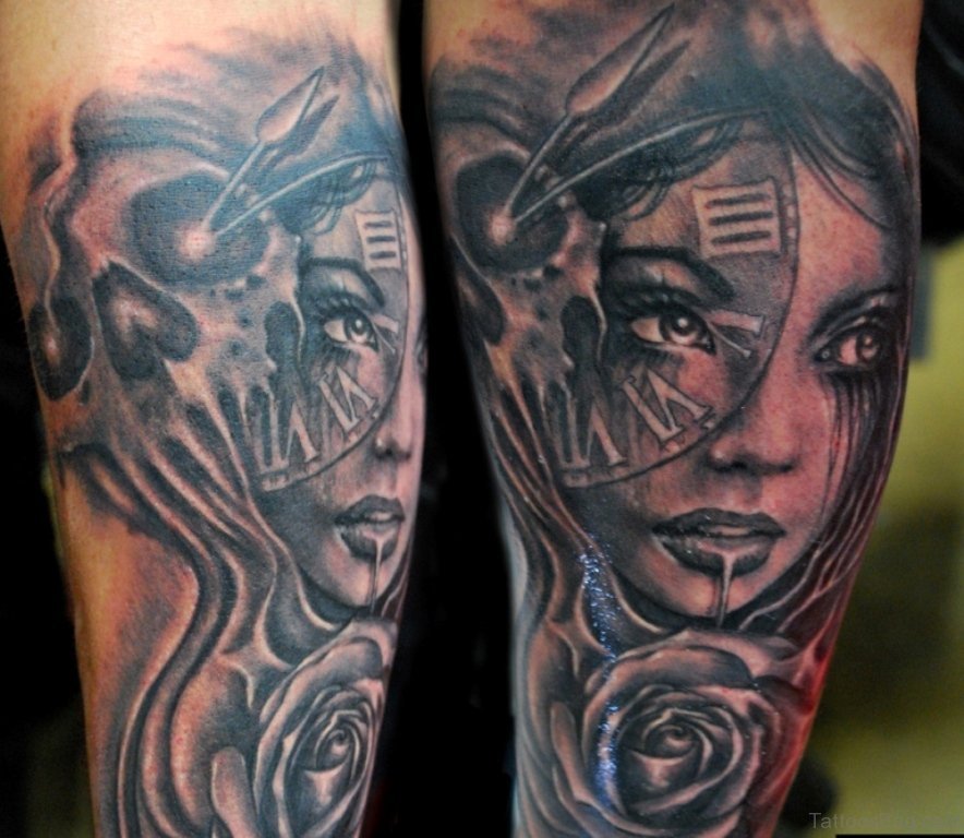 Skull And Girl Portrait Tattoo On Arm