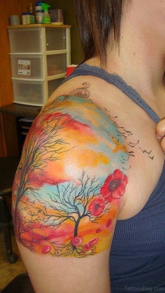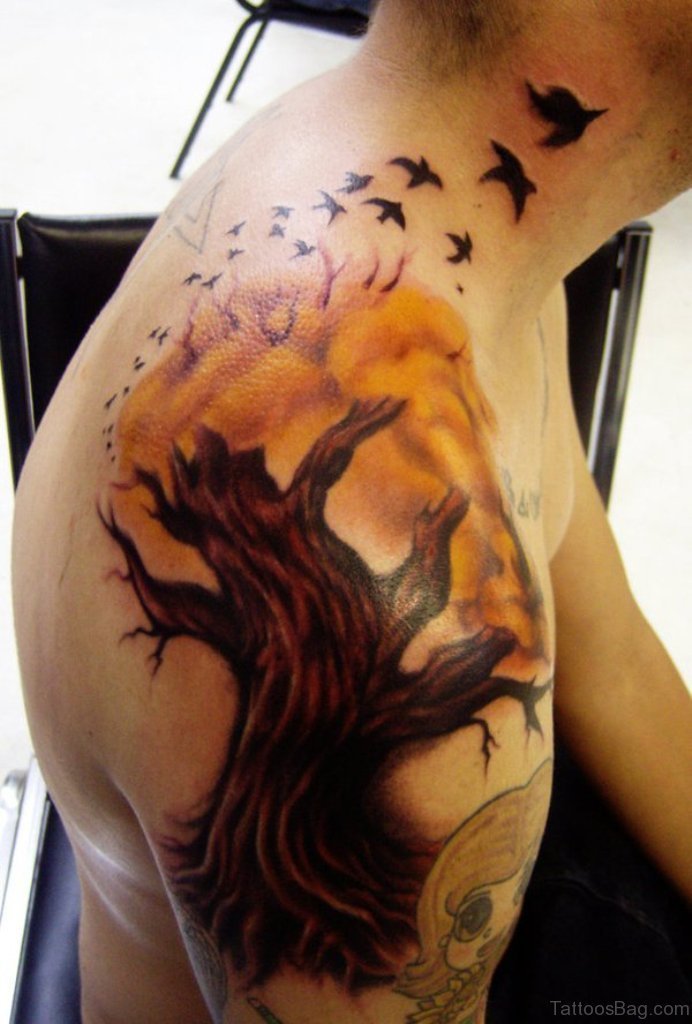 Flying Crows And Tree Tattoos On Left Back Shoulder