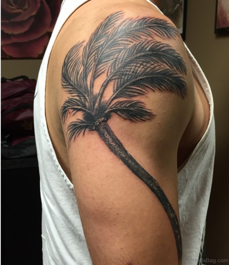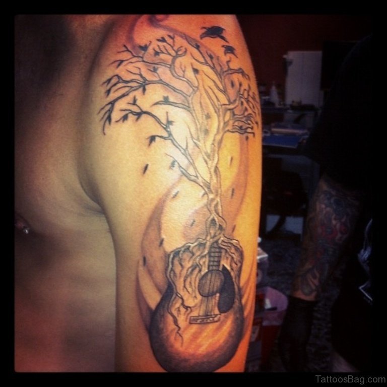 Tree Shaped Head Guitar Tattoo On Shoulder For Men
