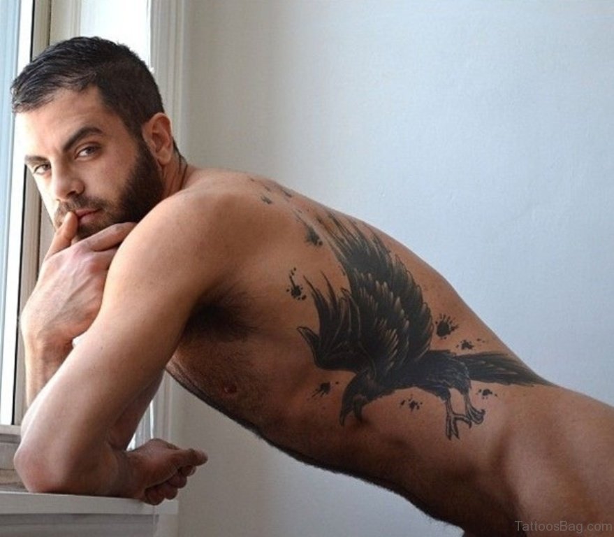 Black Inked Eagle Tattoo On Rib