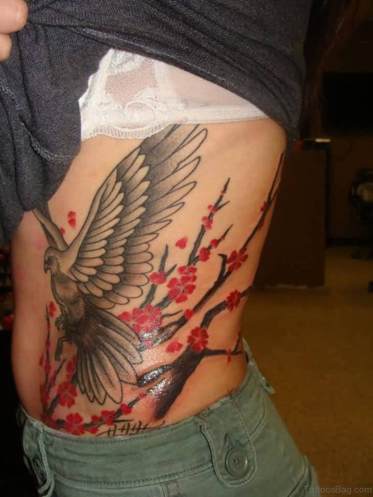 Eagle And Cherry Blossom Tattoo On Rib