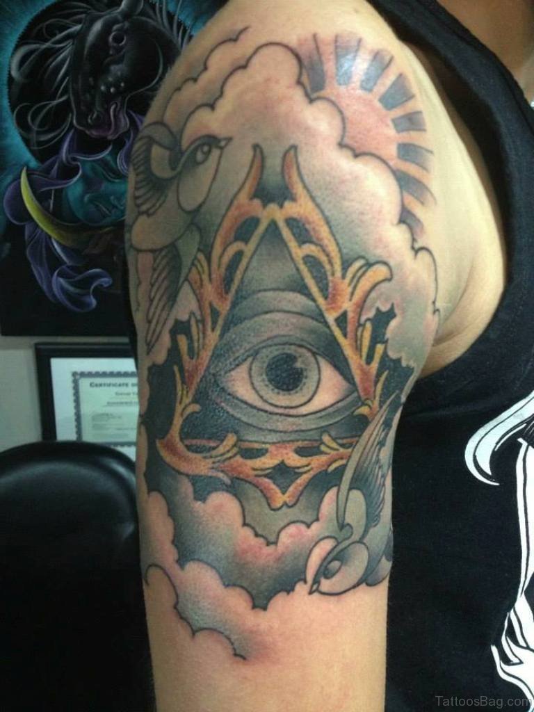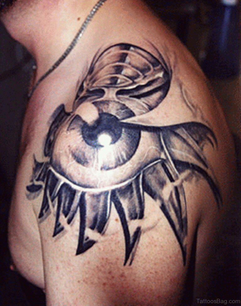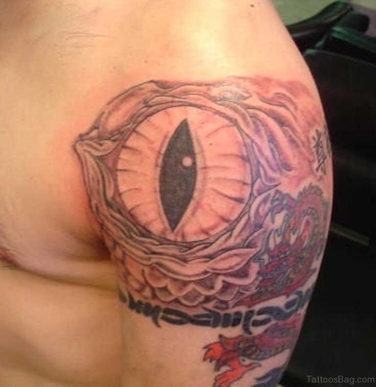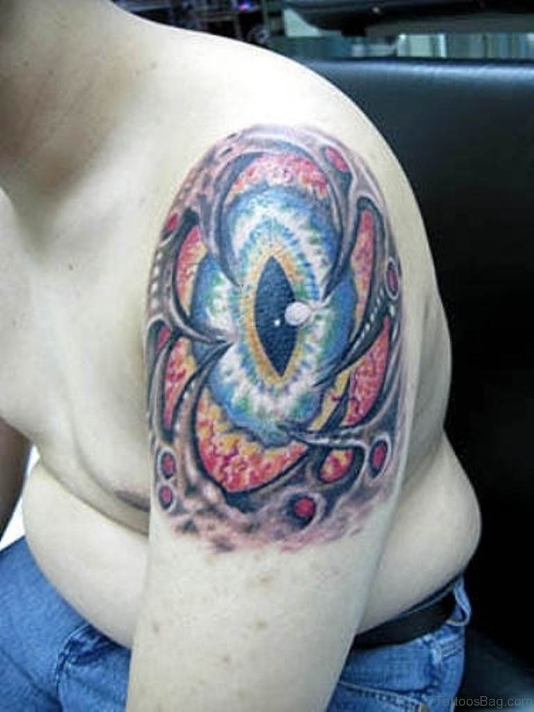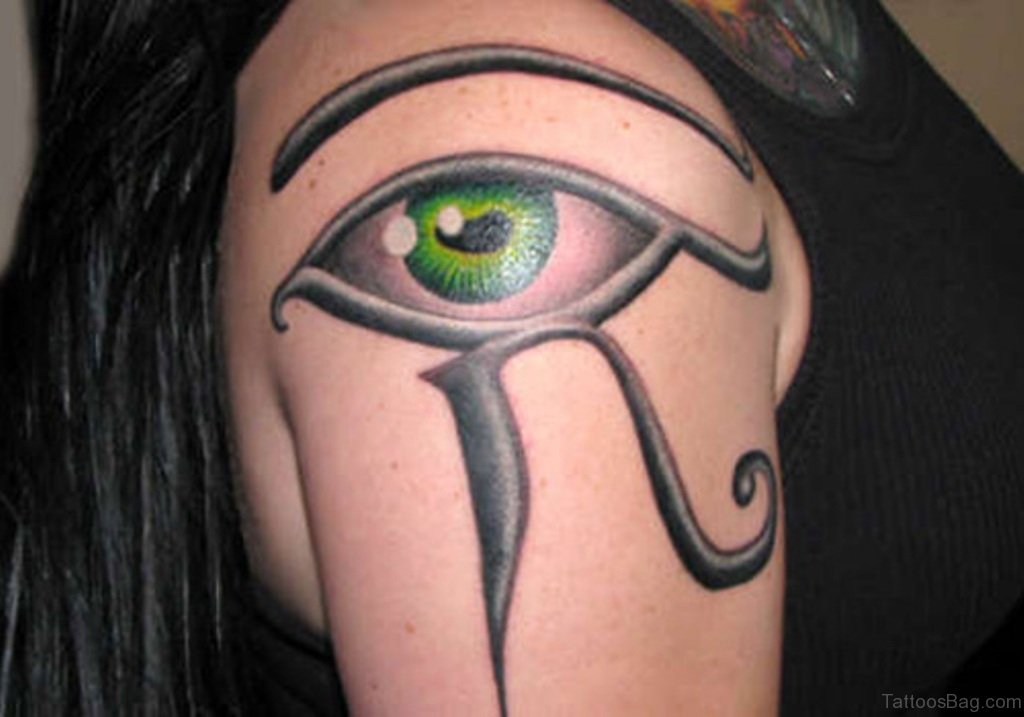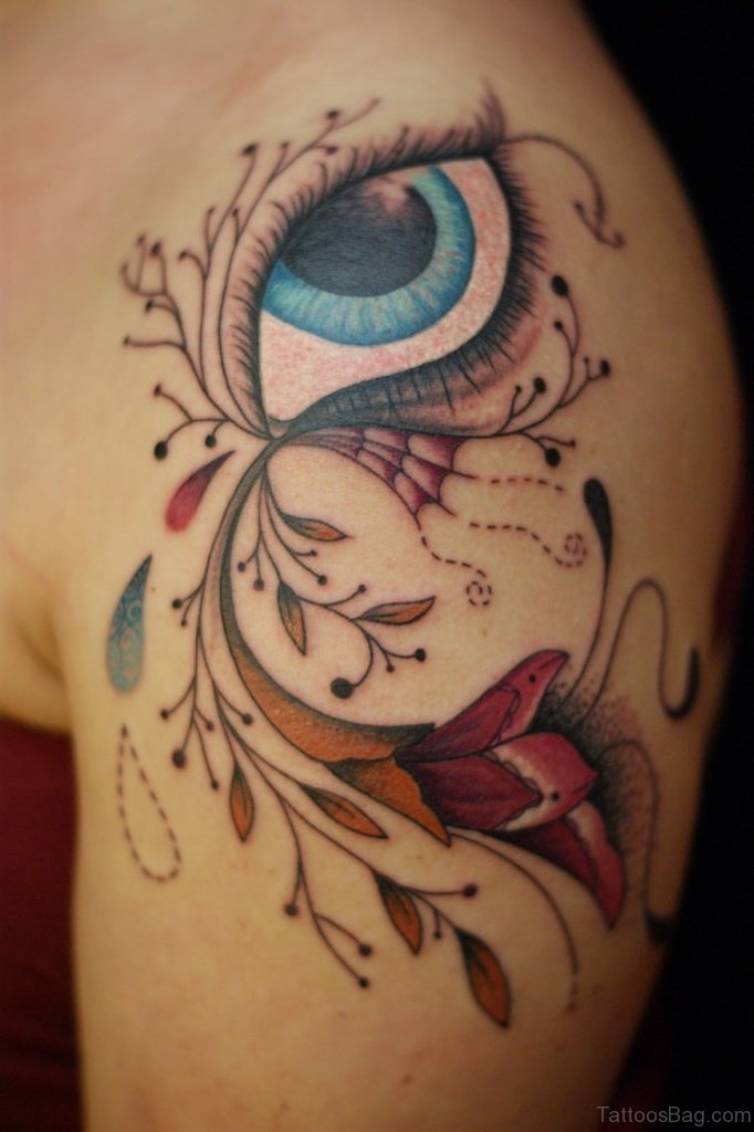 Lady Having Evil Eye Traditional Tattoo On Shoulder