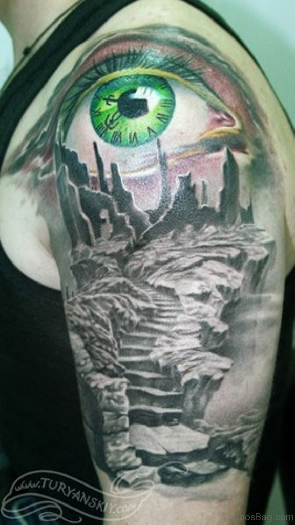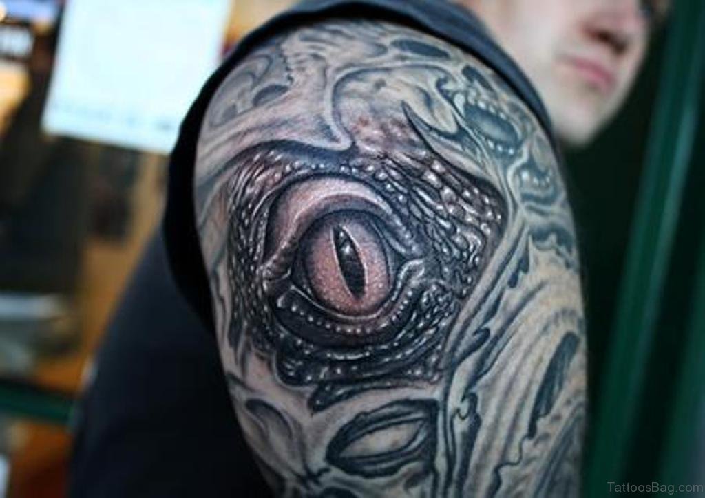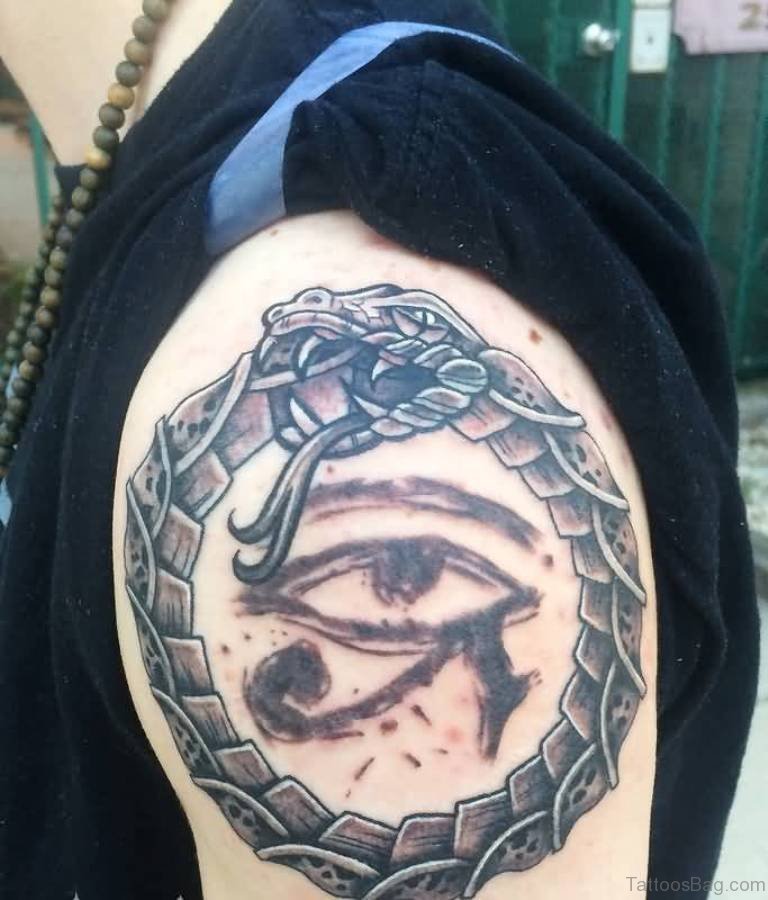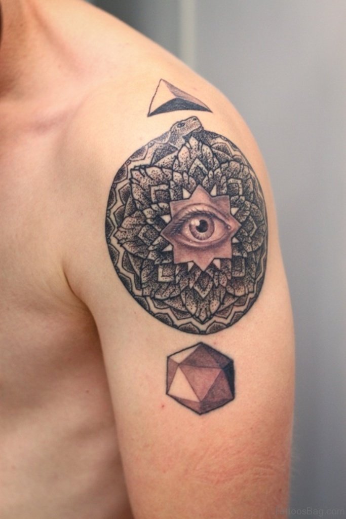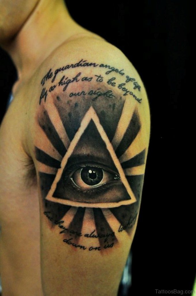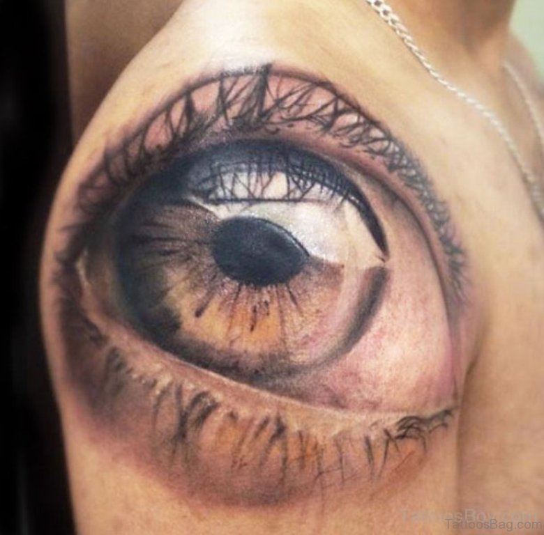 Lady Having Evil Eye Traditional Tattoo On Shoulder