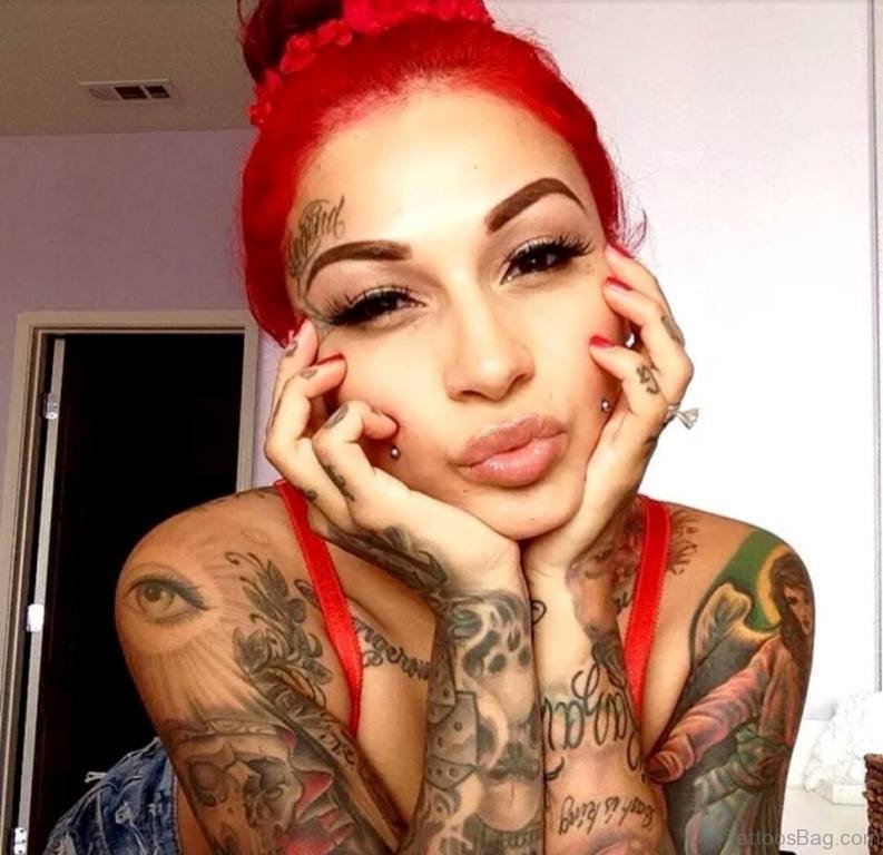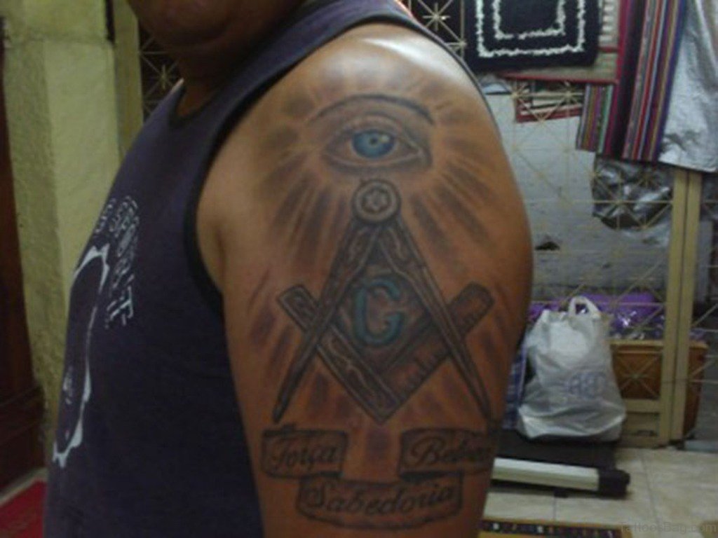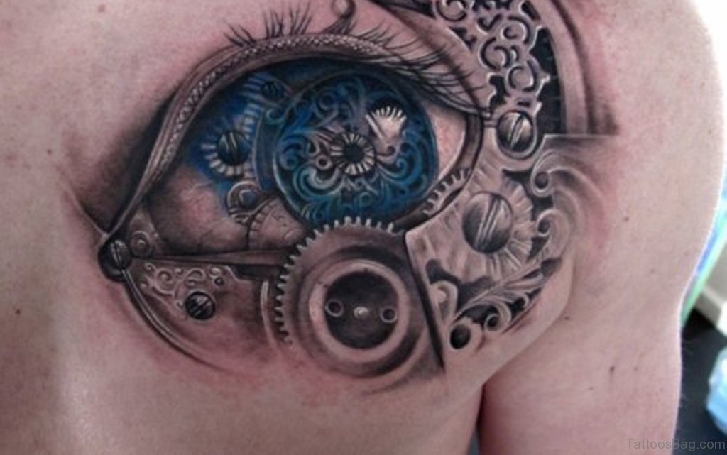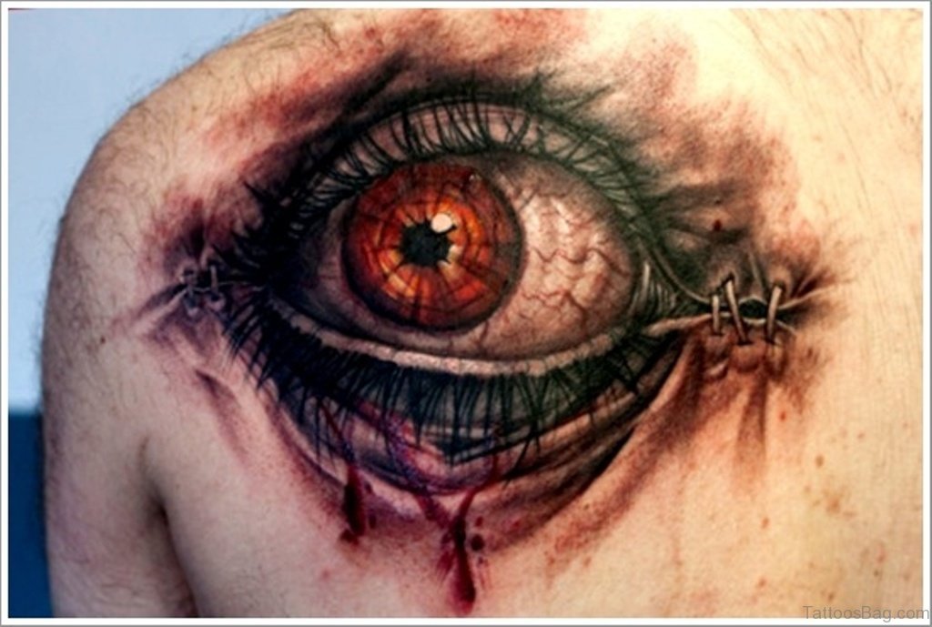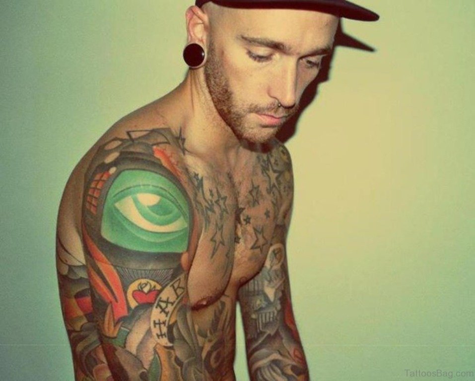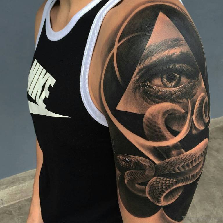 Lady Having Evil Eye Traditional Tattoo On Shoulder