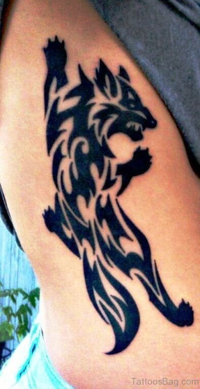 Tribal Black Alpha Wolf Tattoo On Rib