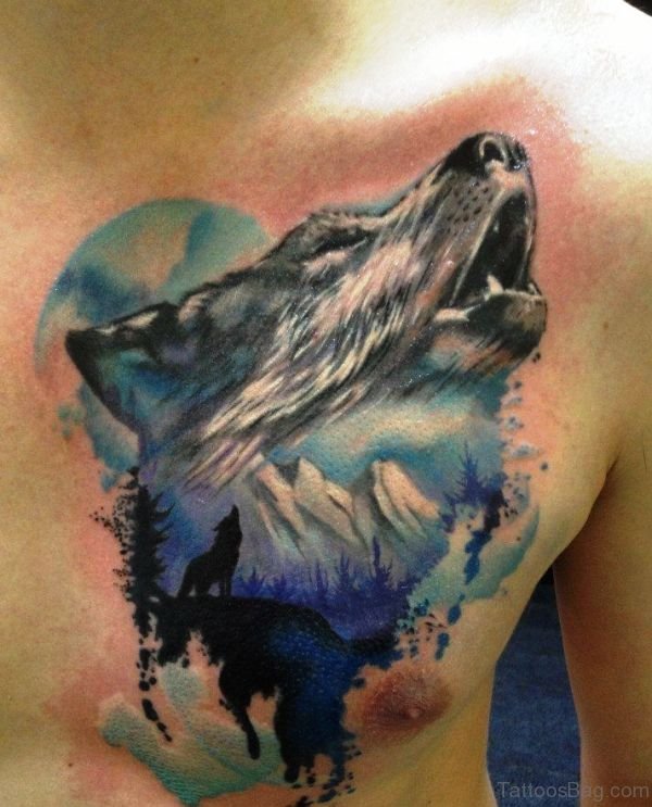 Watercolor Alpha Wolf Tattoo On Chest