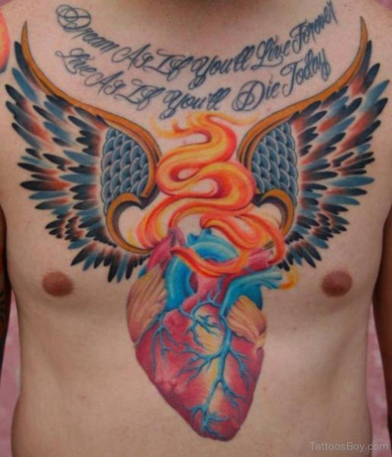 Fire Heart With Wings Tattoo On Chest
