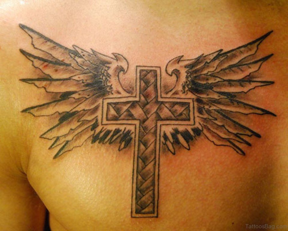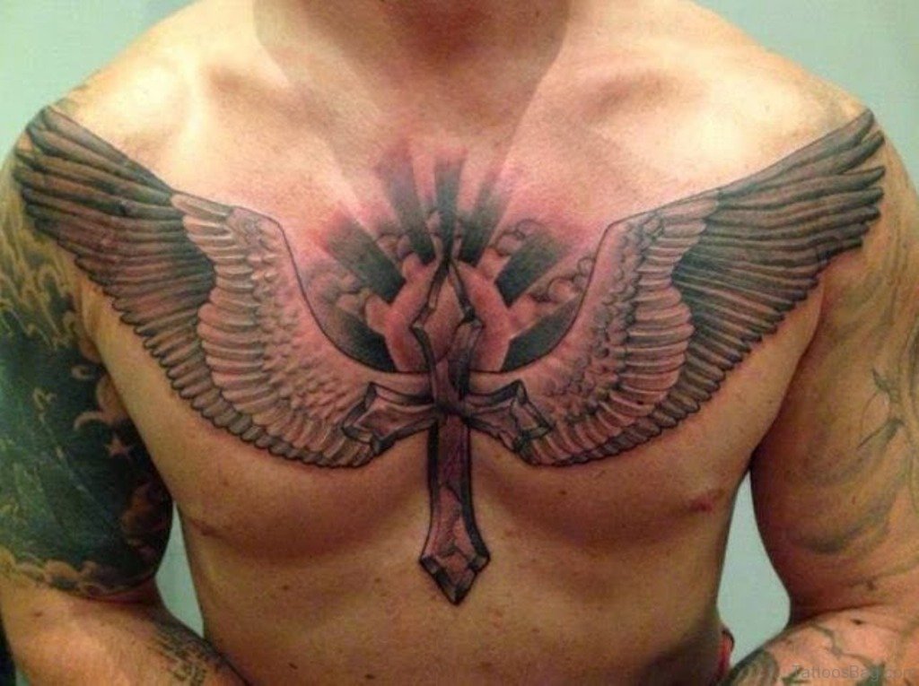 Cross And Wings Tattoo On Chest
