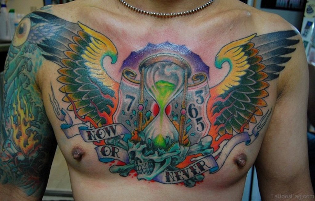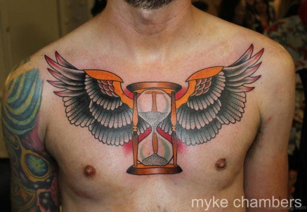 Clock Heart With Wings Tattoo On chest