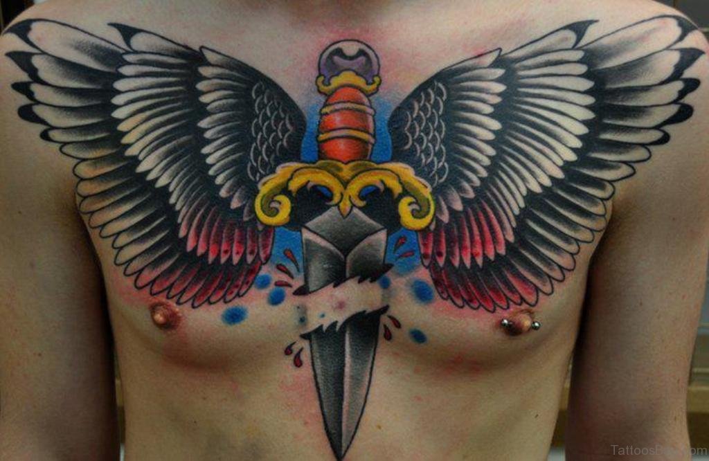 Dagger And Wings Tattoo On Chest
