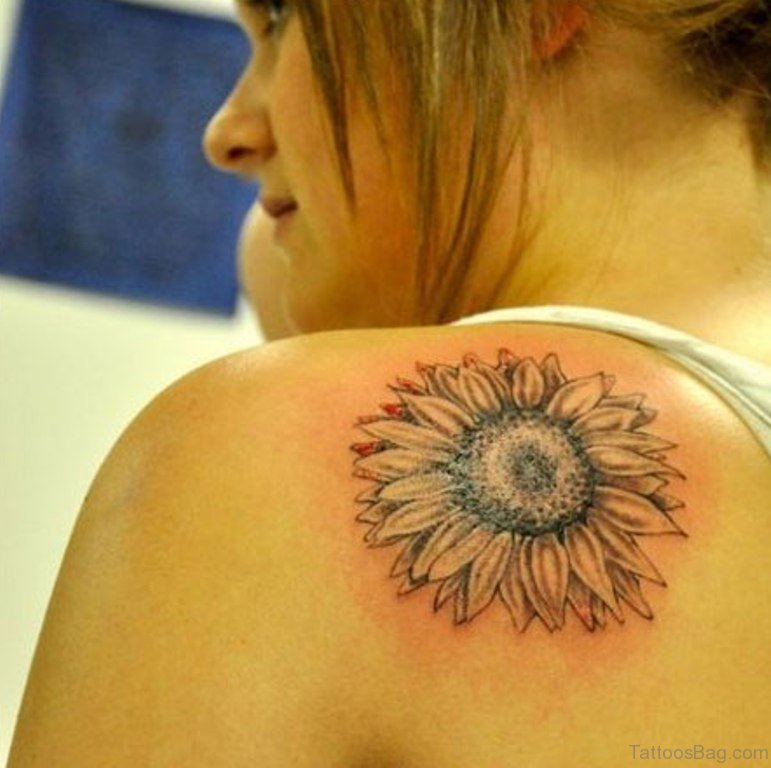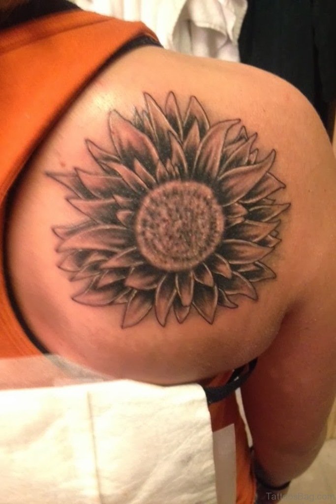 Grey Ink Sunflower Tattoo On Right Back Shoulder