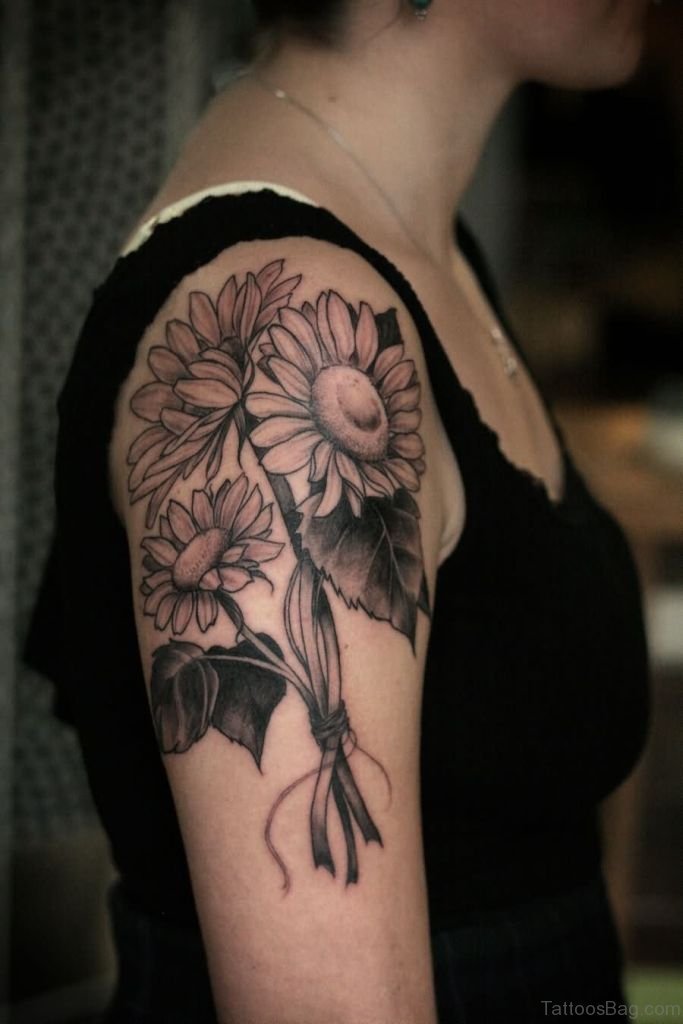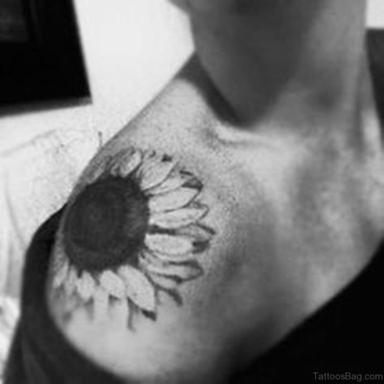 Realistic Grey Ink Sunflower Tattoos For Shoulder