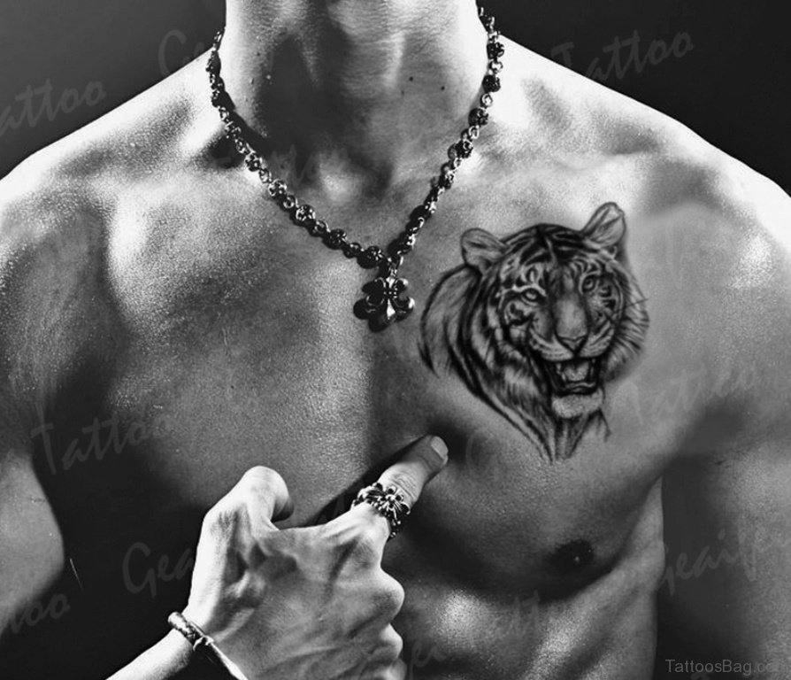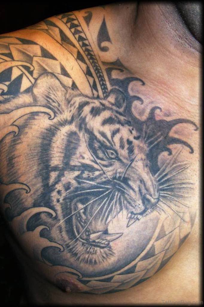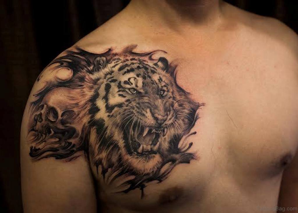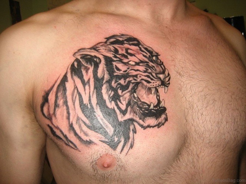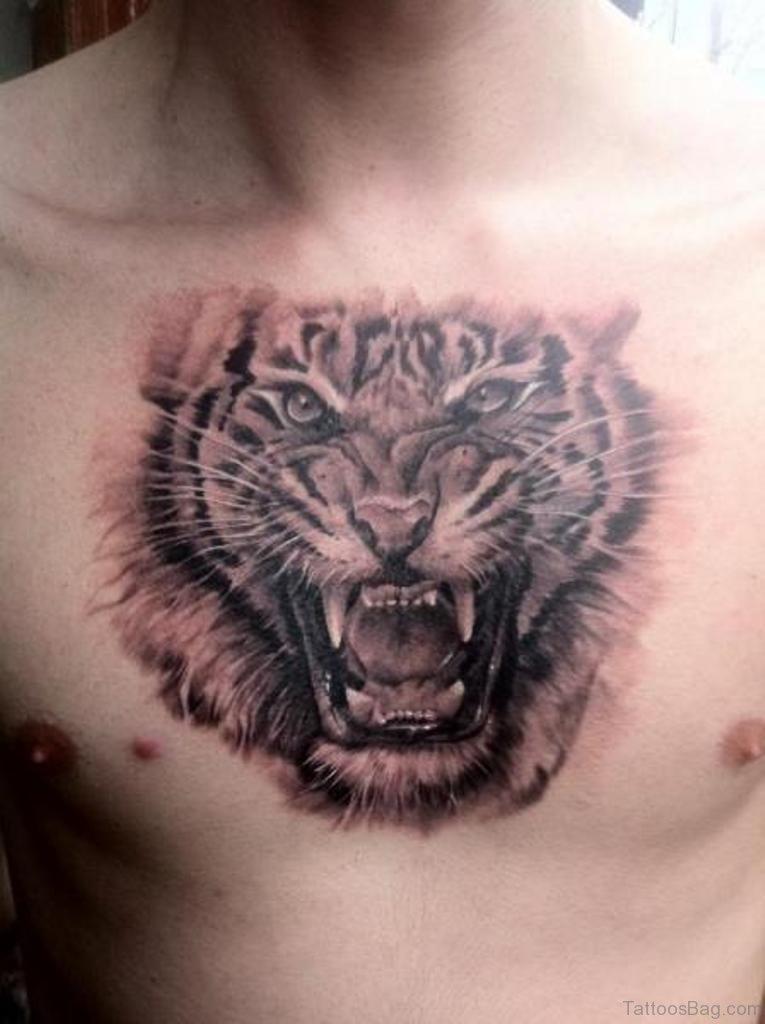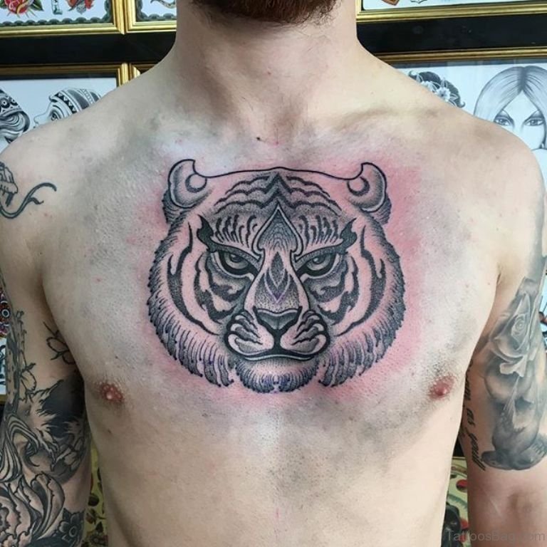 Grey Ink Tiger Head Tattoo On Chest For Men