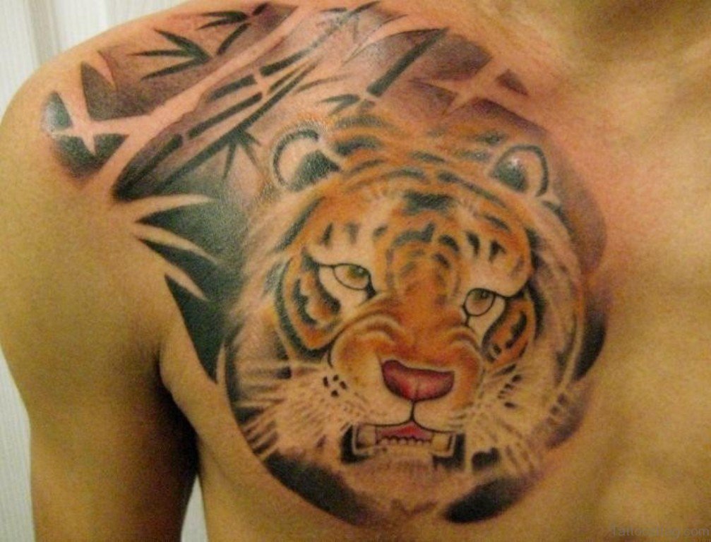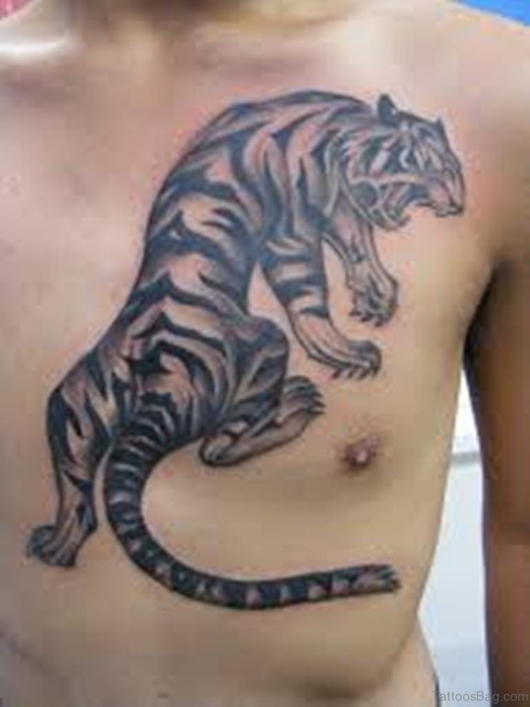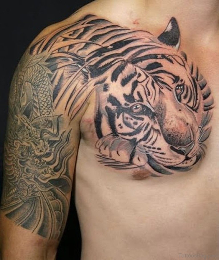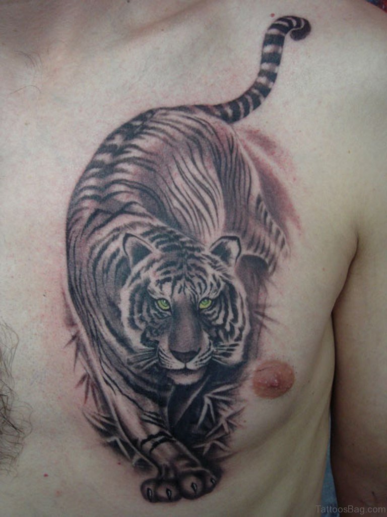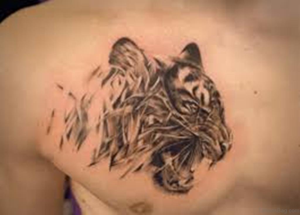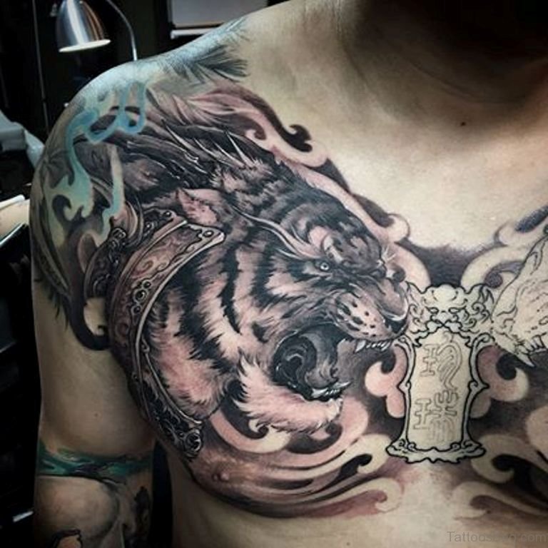 Grey Ink Tiger Head Tattoo On Chest For Men