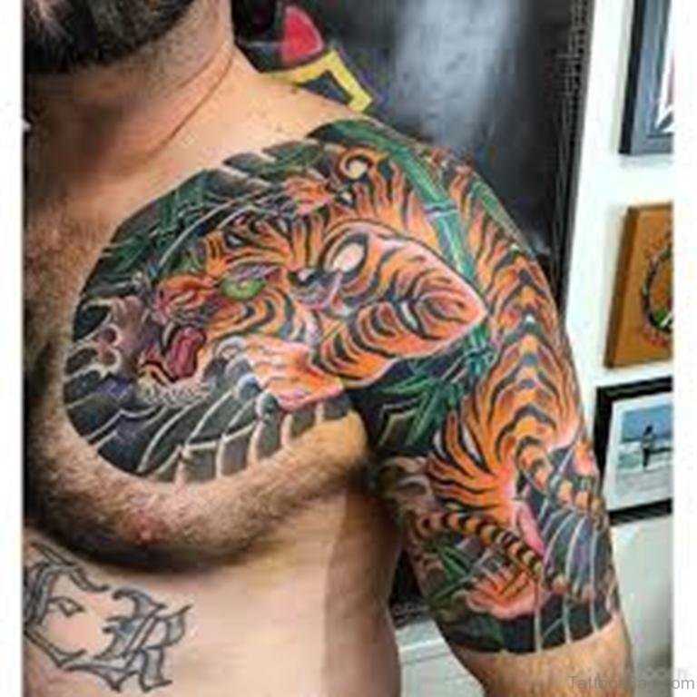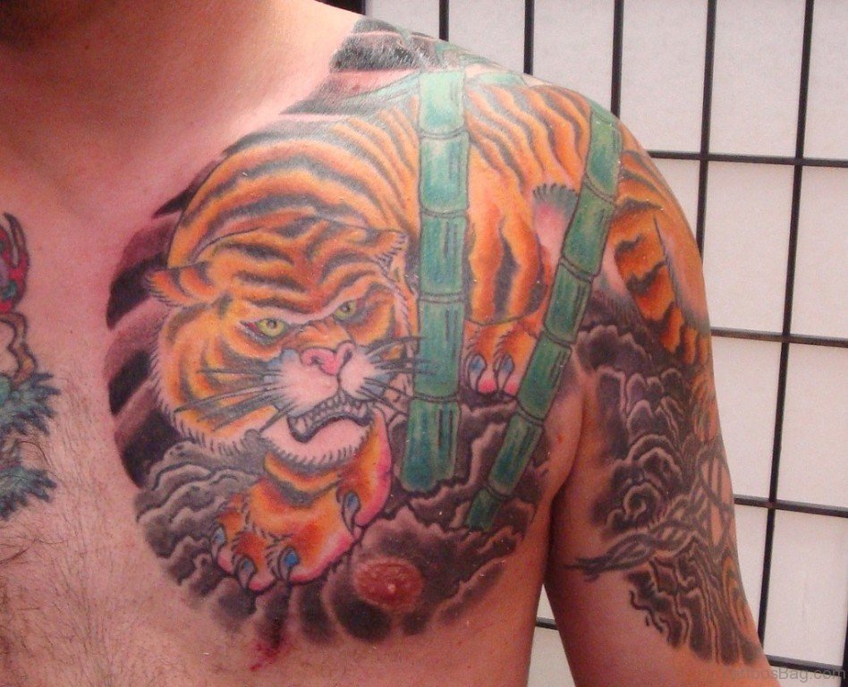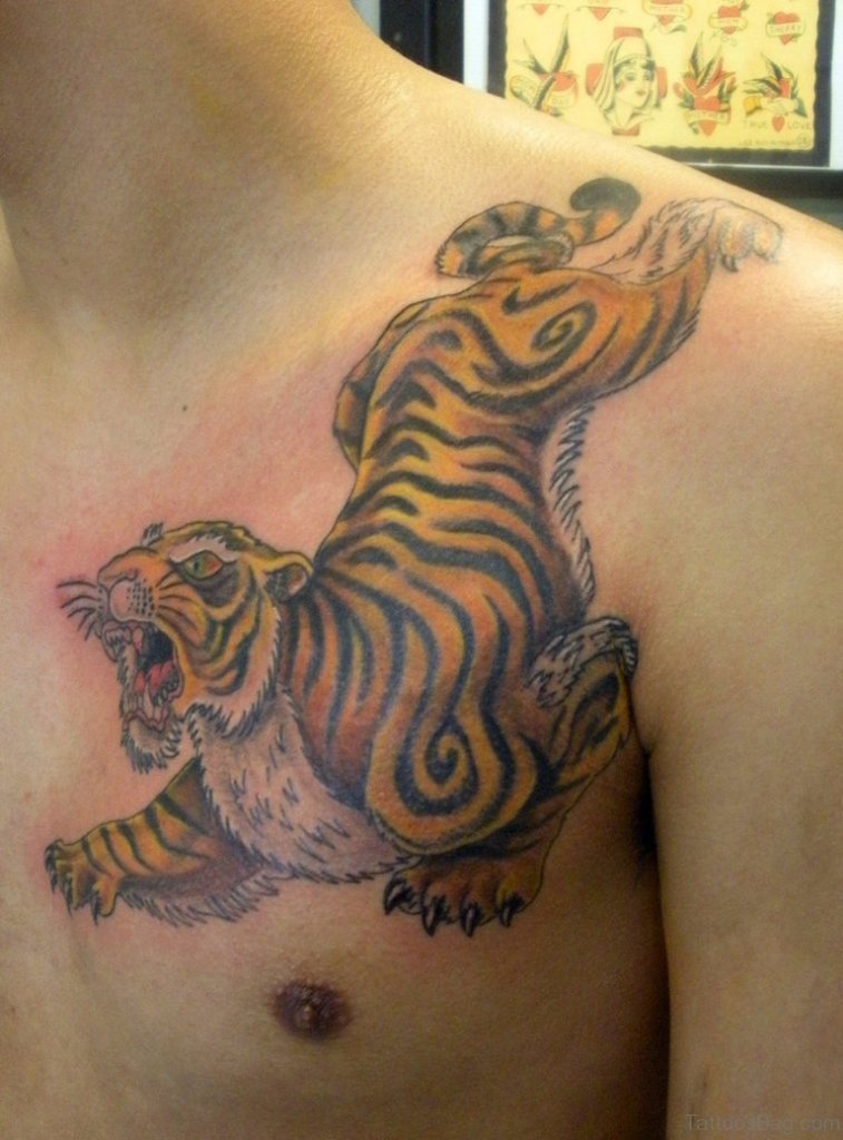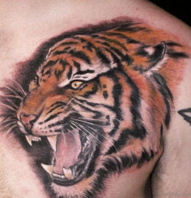 Amazing Roaring Tiger Head Tattoo On Man Chest
