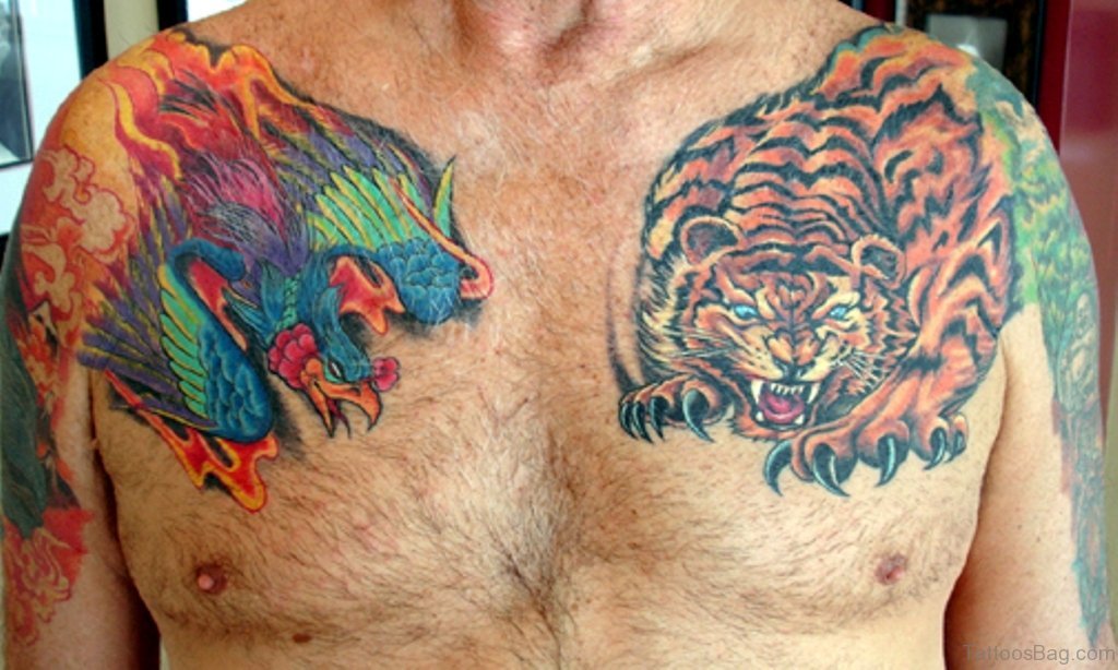 Grey Ink Tiger Head And Rose Tattoo On Chest