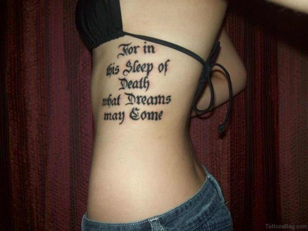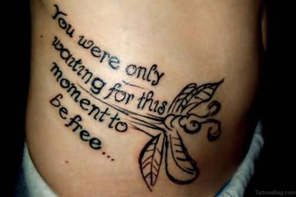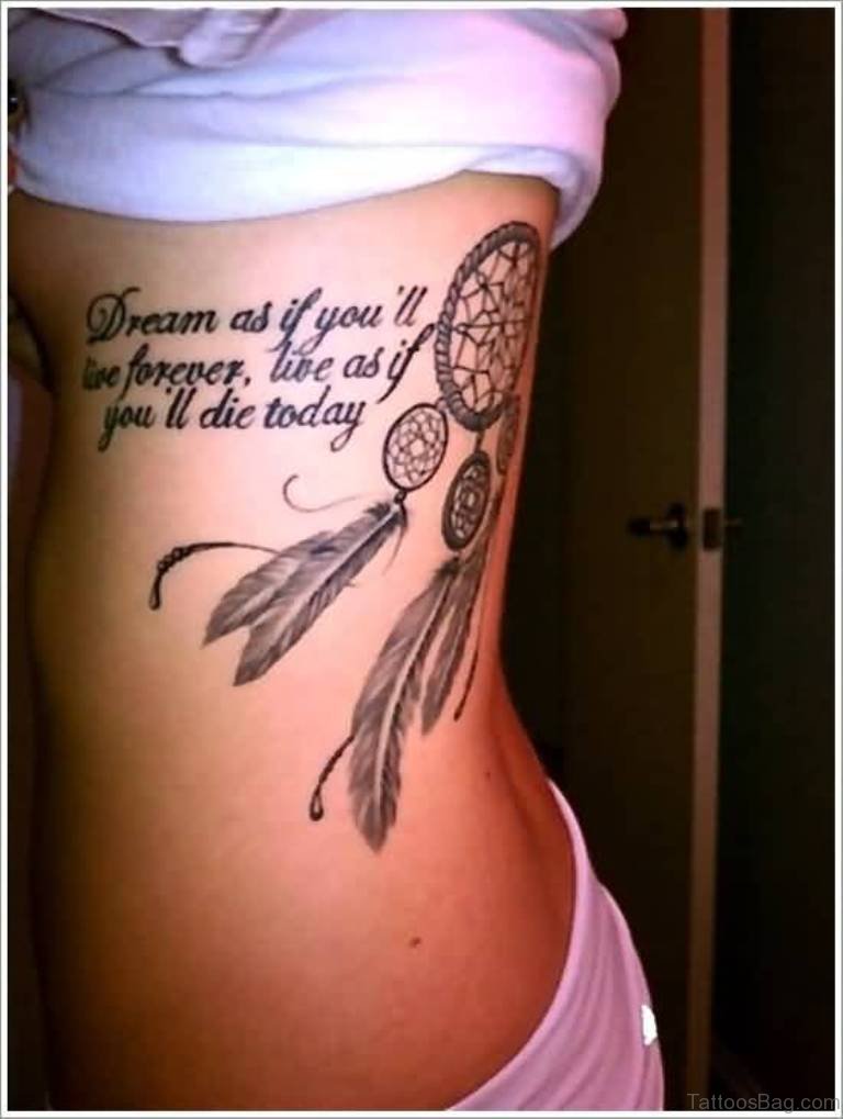 Lovely Wording And Great Dream Catcher Feather Tattoo On Rib Side
