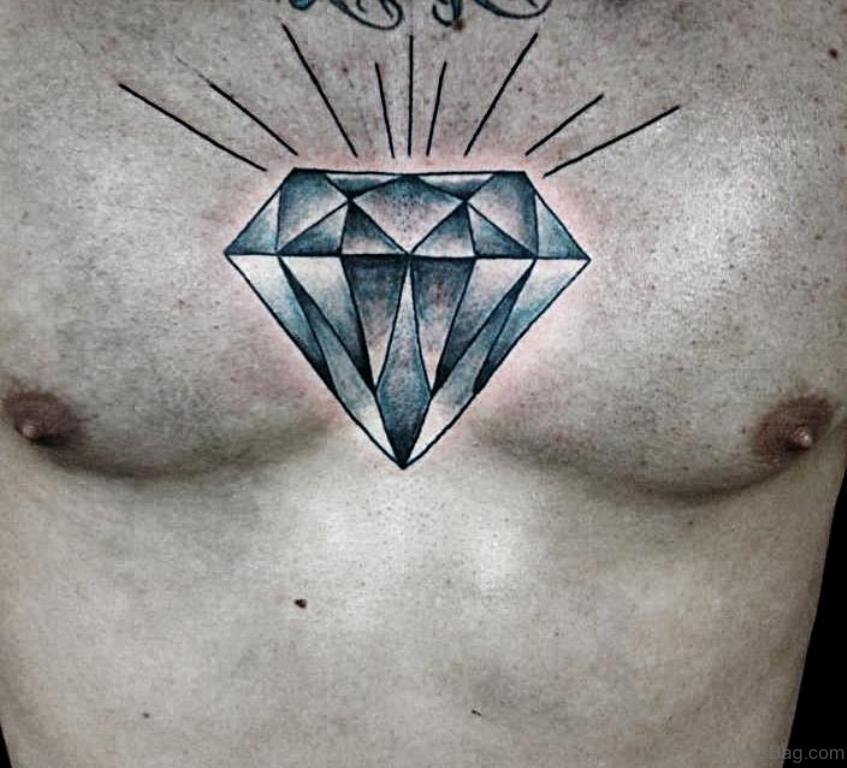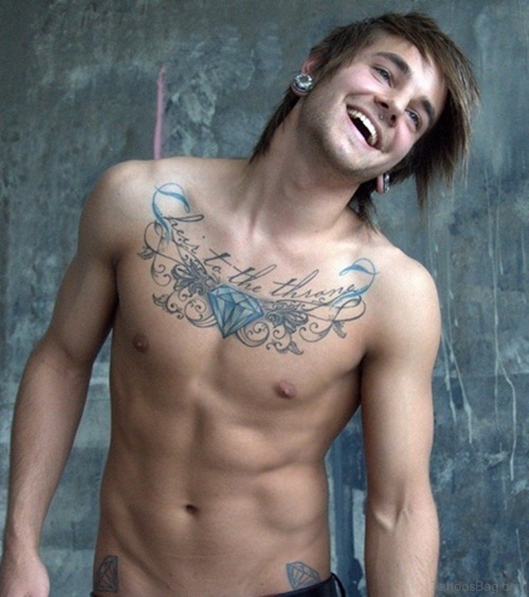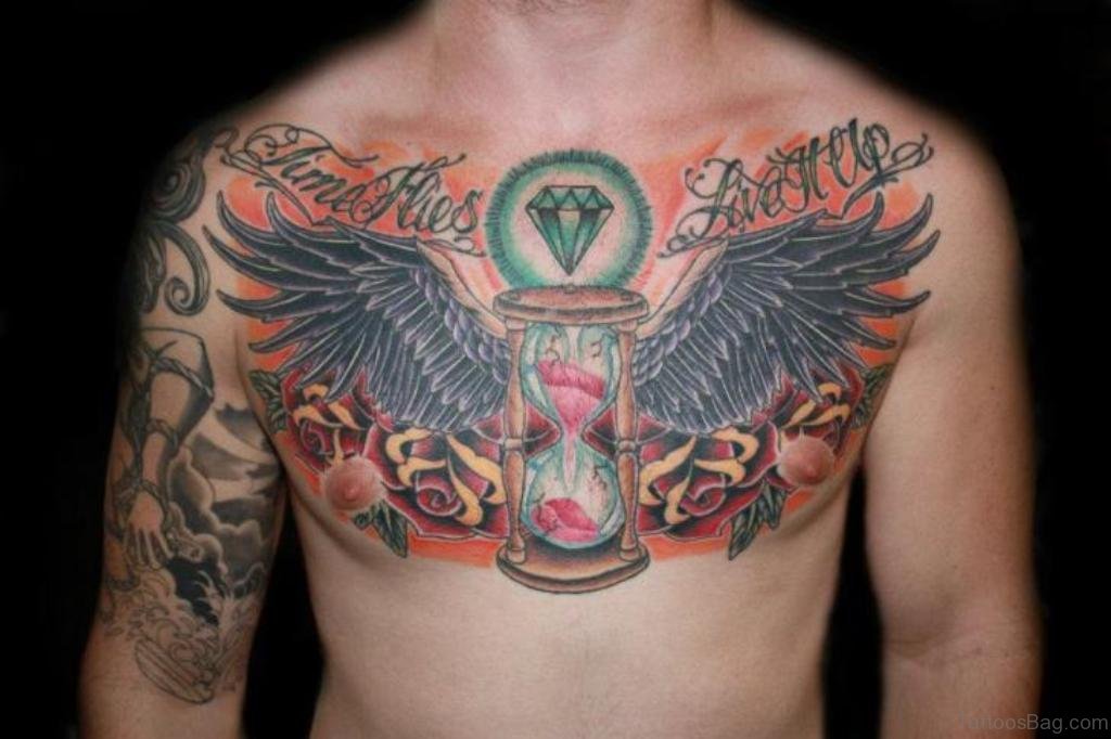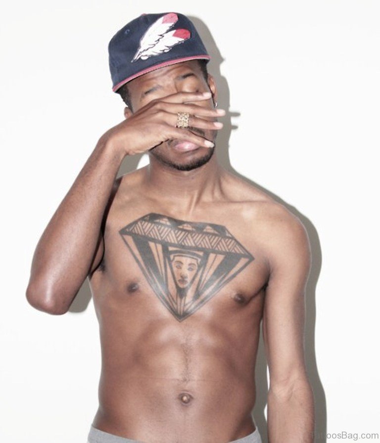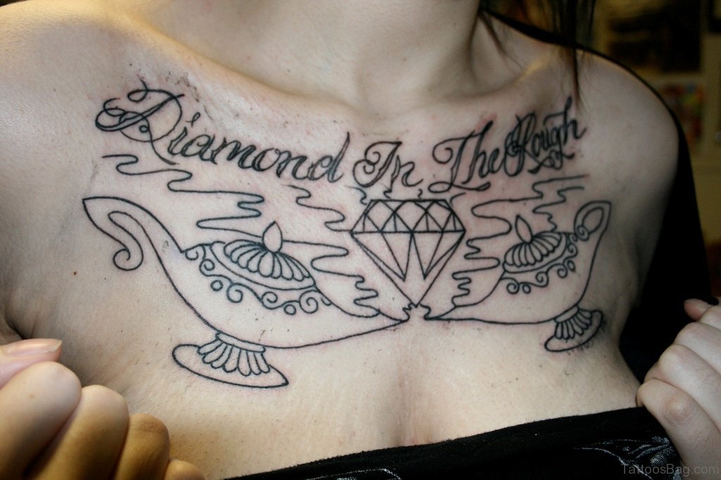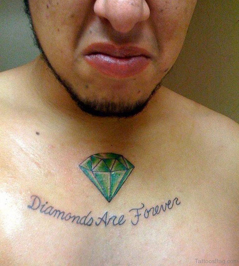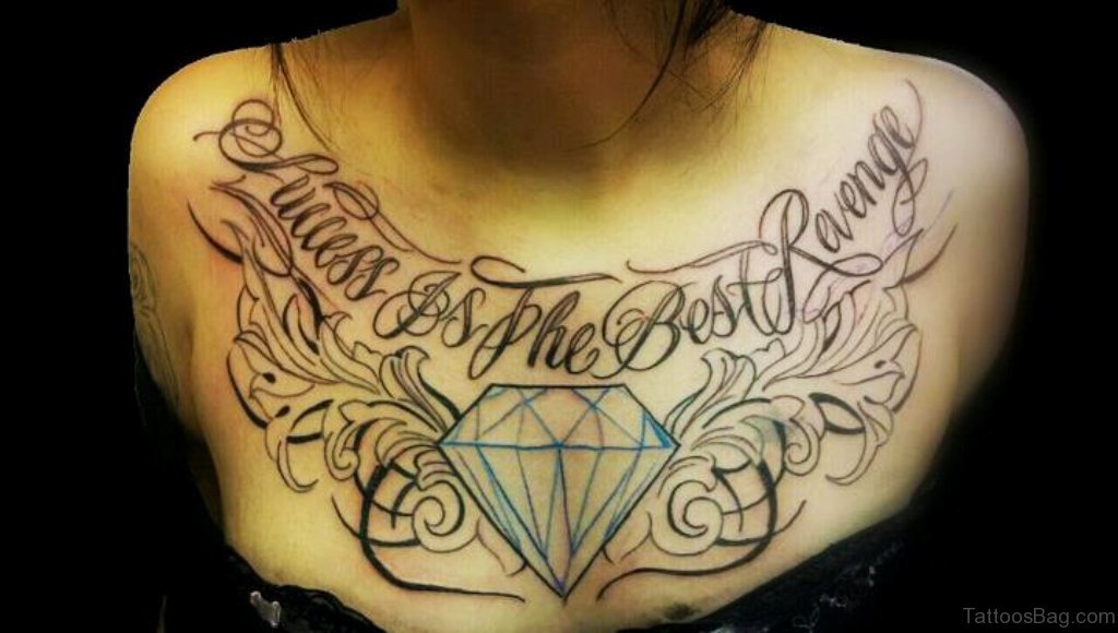 Never Look Back Banner And Winged Diamond Tattoo On Chest