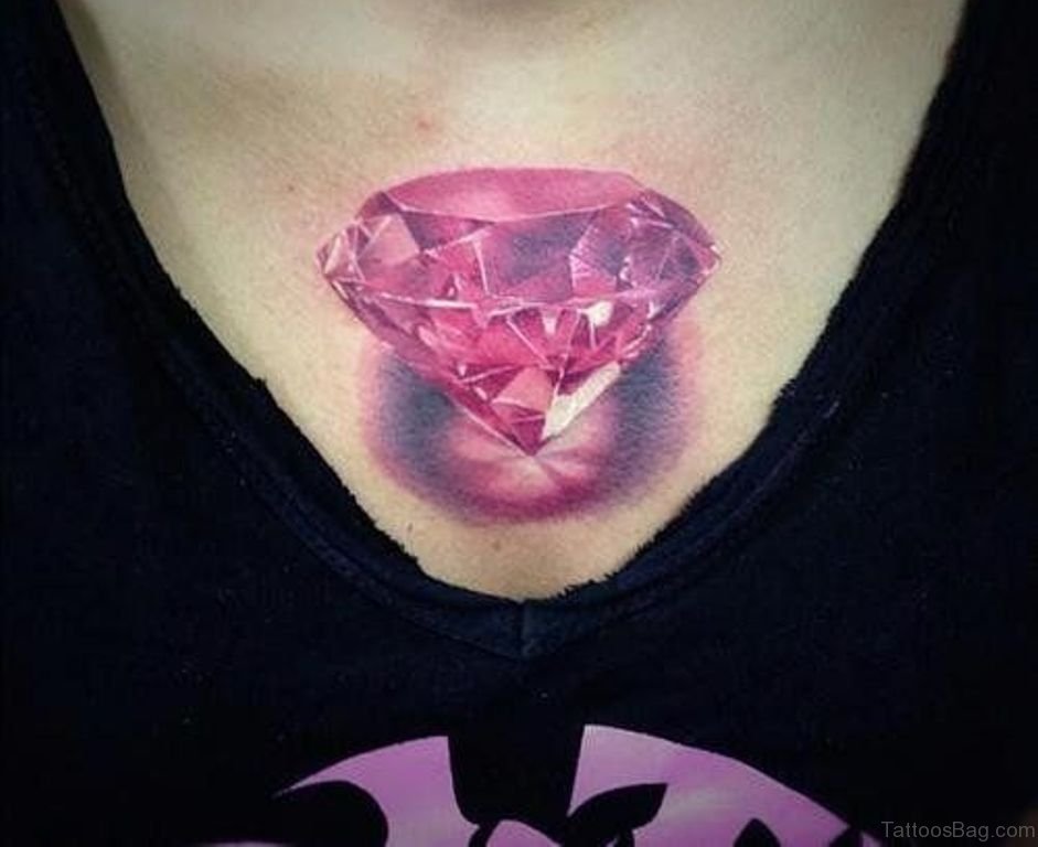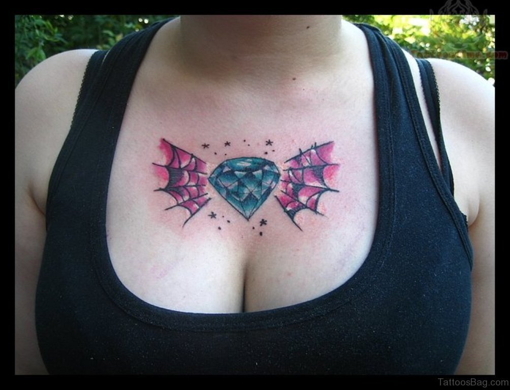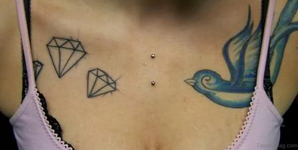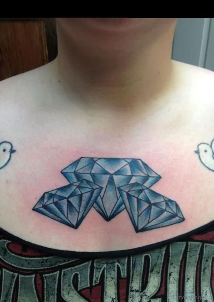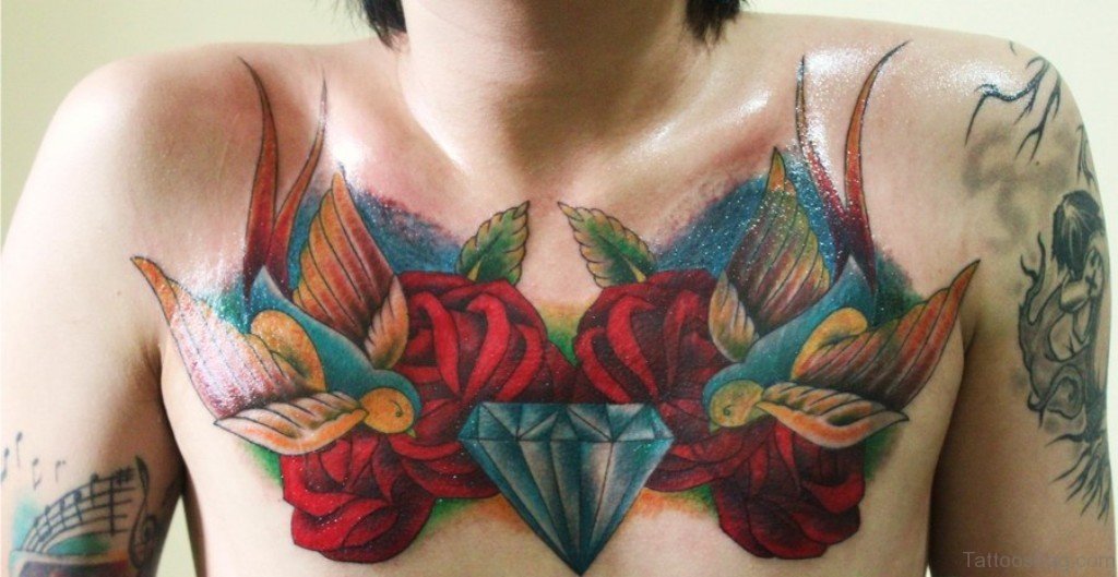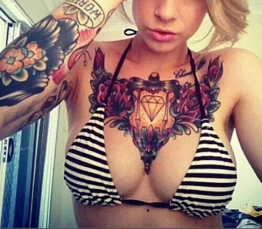 Color Diamond And Flowers Tattoo On Chest For Girls