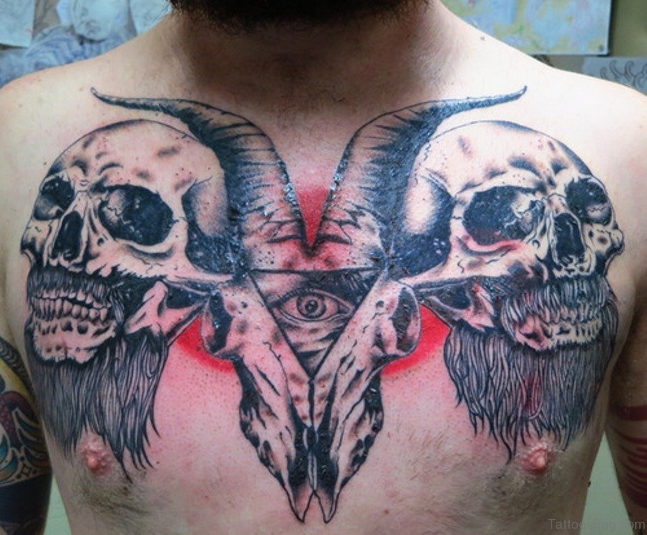 Goat Skull And Skulls Chest Tattoo