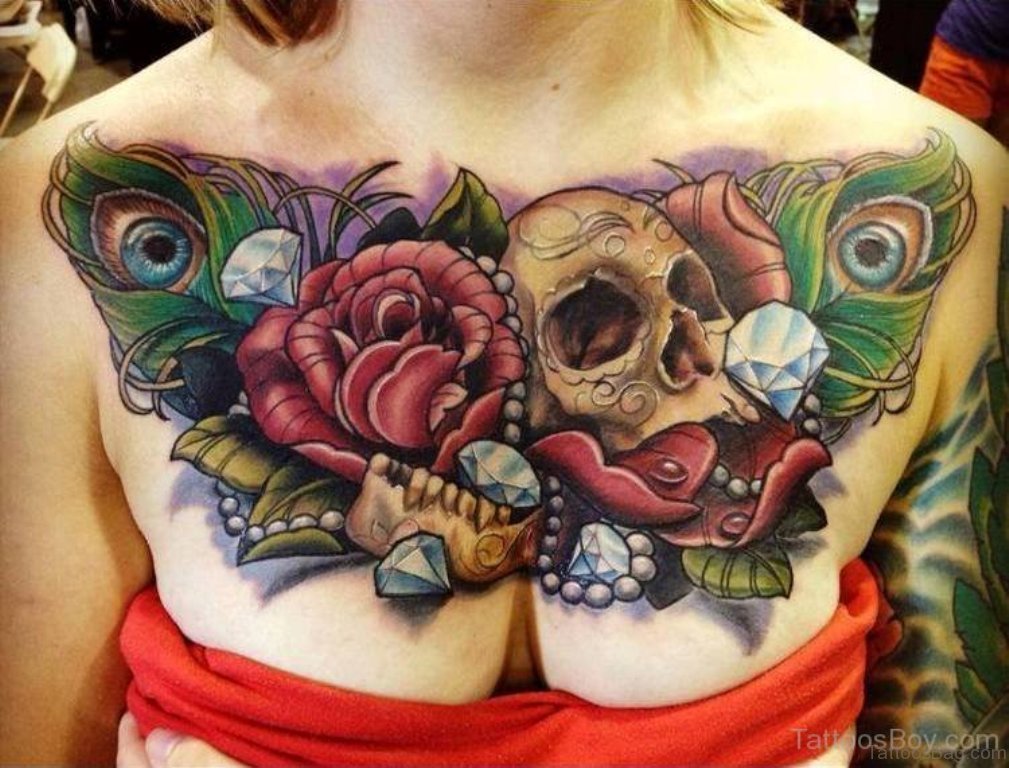 Rose And Skull Tattoo On Chest