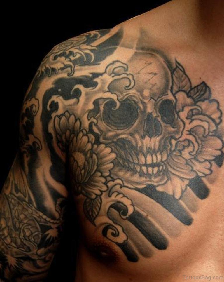Japanese Skull and Flowers Tattoo On Chest