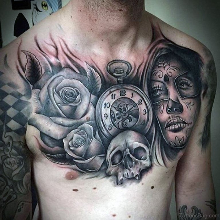 Male With Rose Time Piece Skull And Day Of The Dead Lady Tattoo Chest