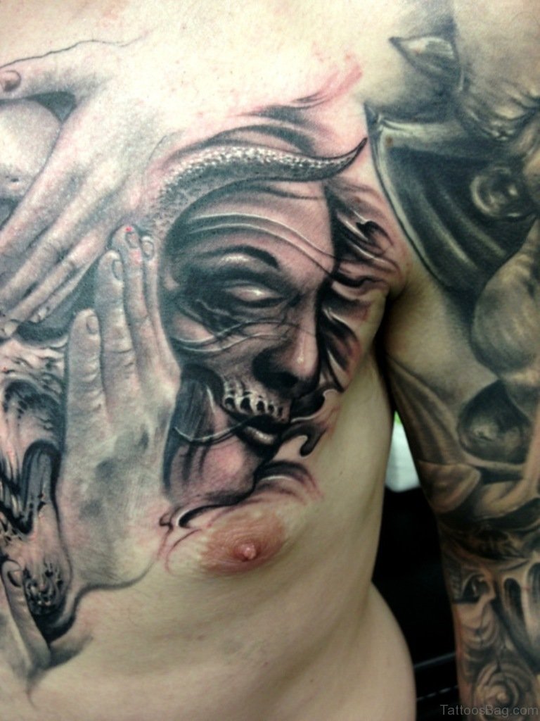 Skull Face Tattoo On Chest