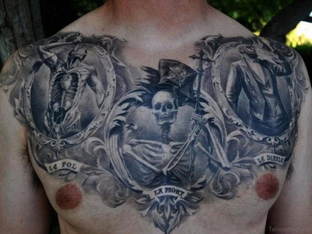 Grey Ink Skulls Tattoo On Chest