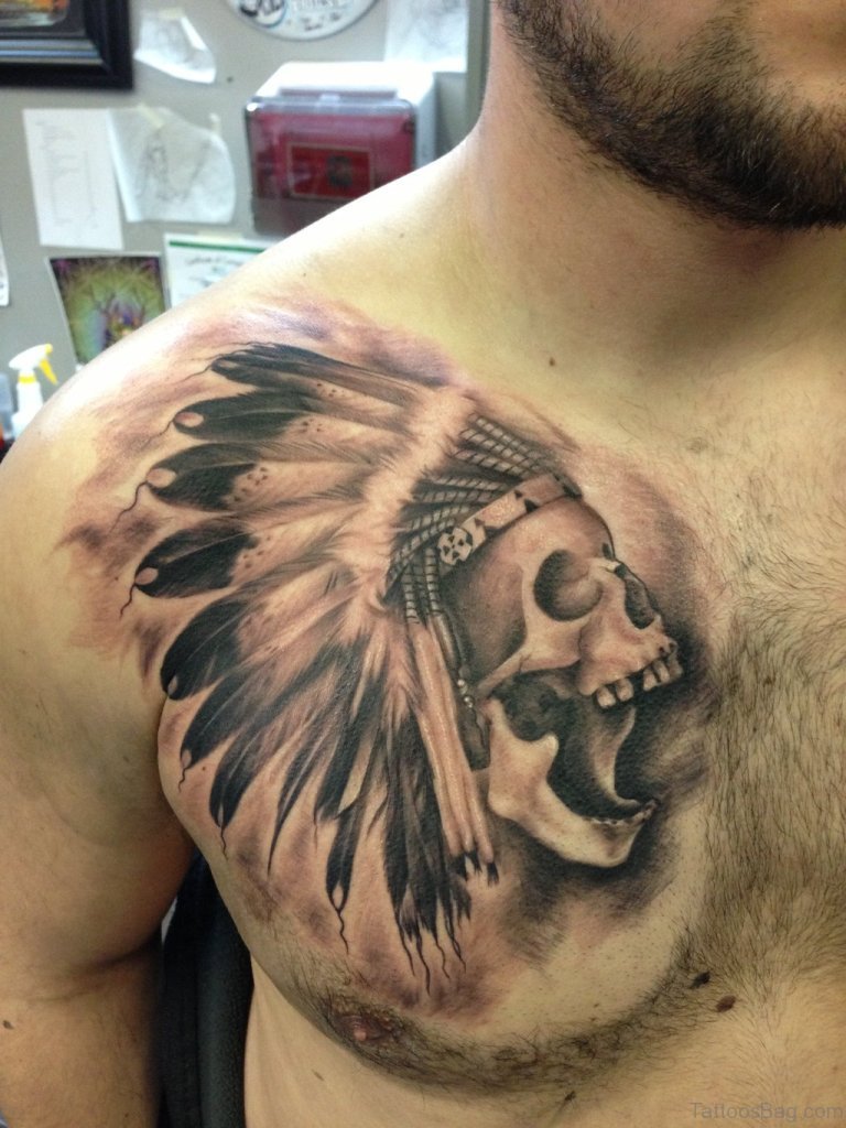 Native American Horned Skull Tattoo On Chest